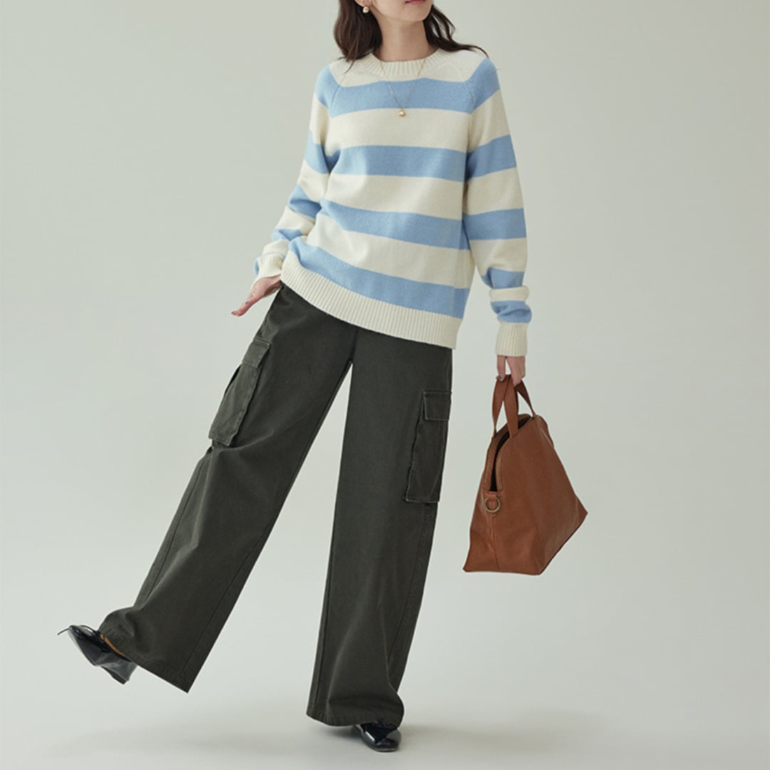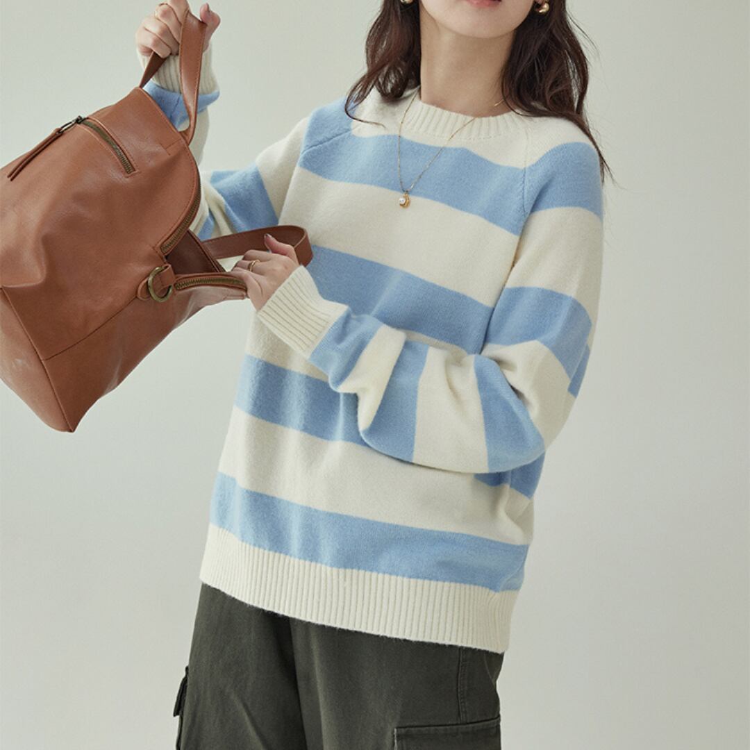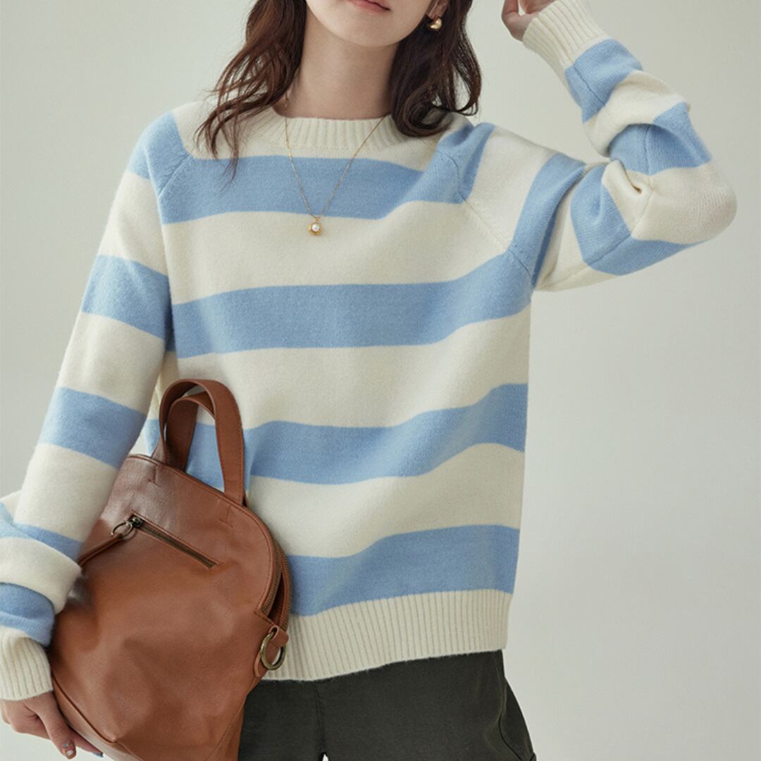 やさしい配色の太ボーダー柄が目を引く、ラグランスリーブ仕様のニットトップス。