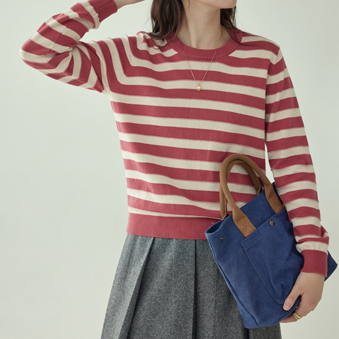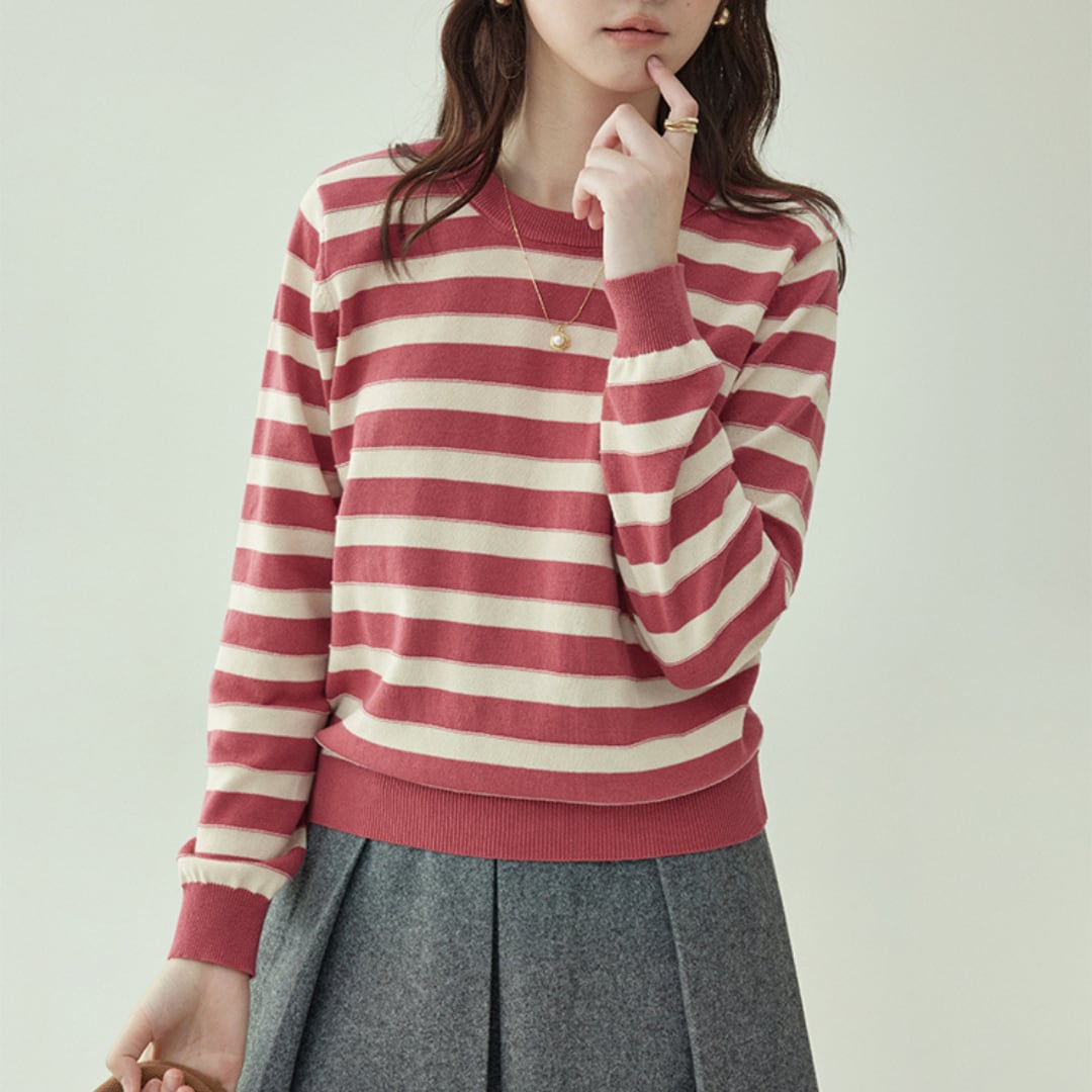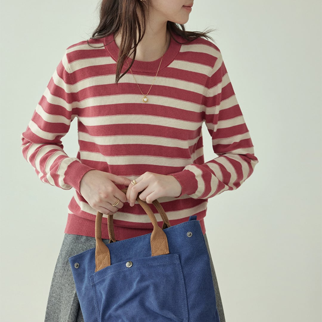 ナチュラルな風合いが魅力のコットン100%ボーダーニット。シンプルながらも印象的な配色で、コーディネートの主役として活躍します。