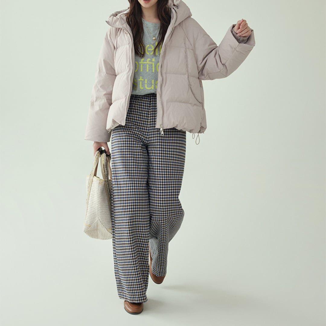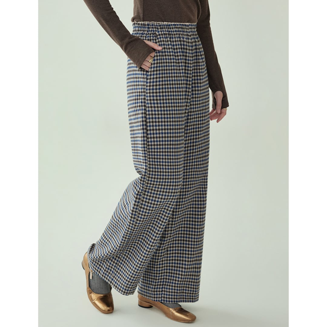 ゆったりとしたシルエットと高めのウエストが魅力のチェック柄ワイドパンツ。