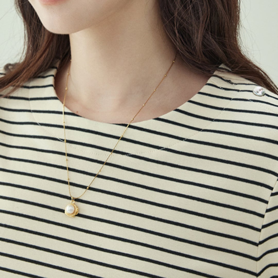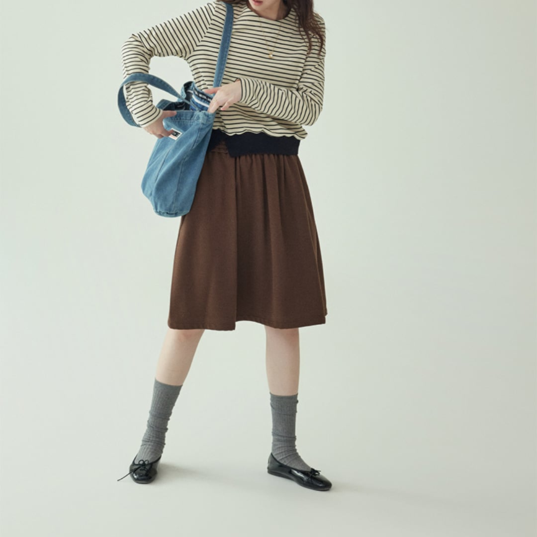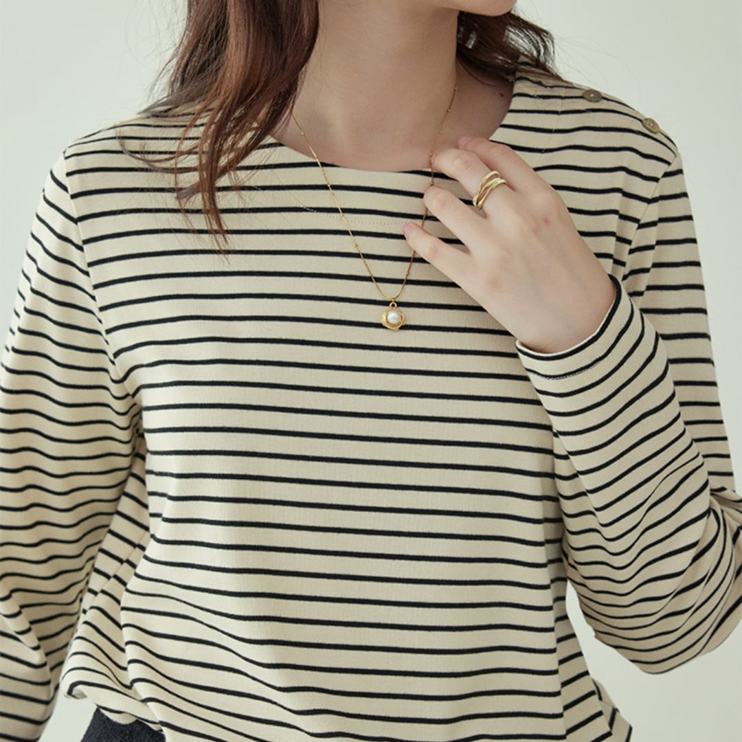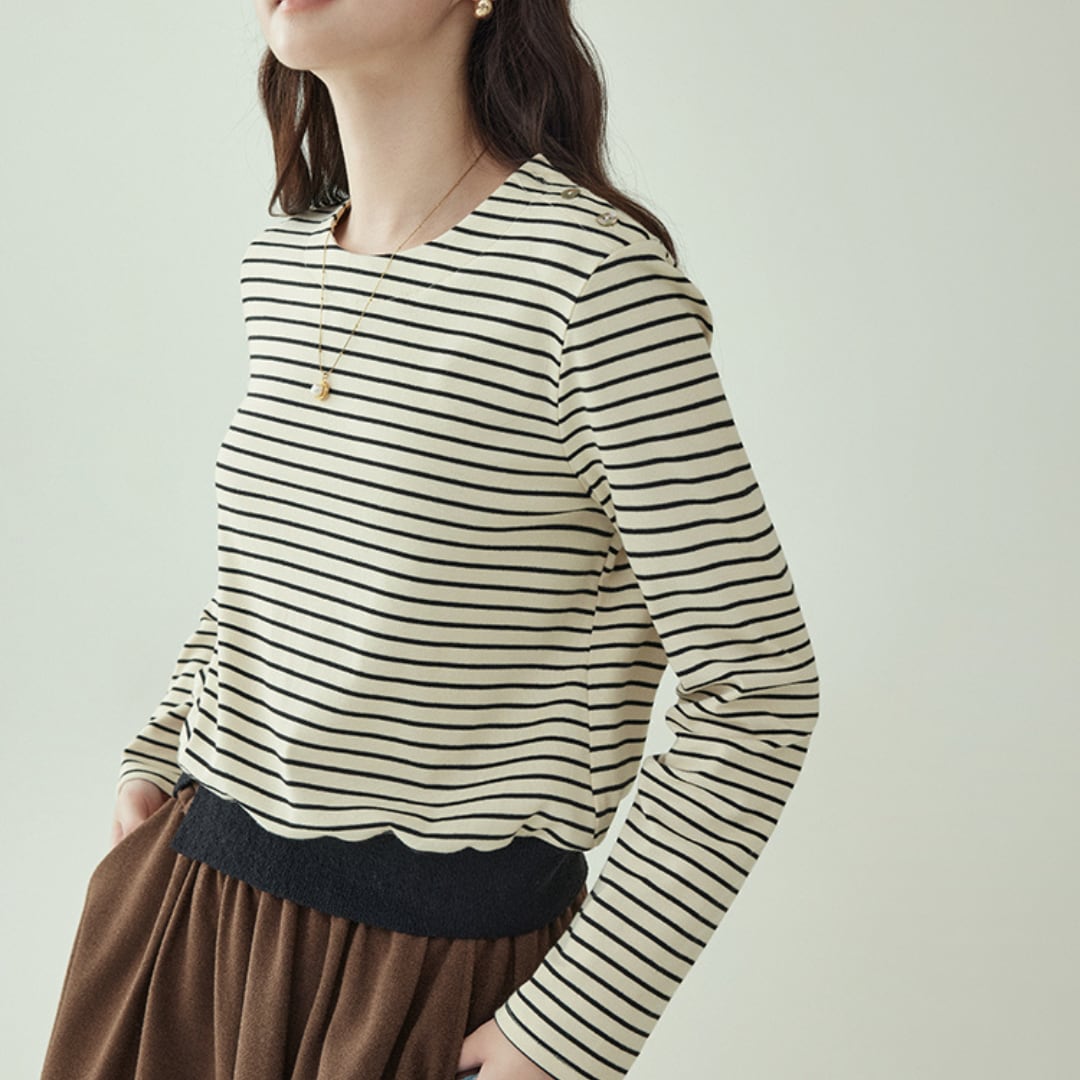 柔らかな風合いと裾のさりげない開きがポイントのボーダー柄トップス。