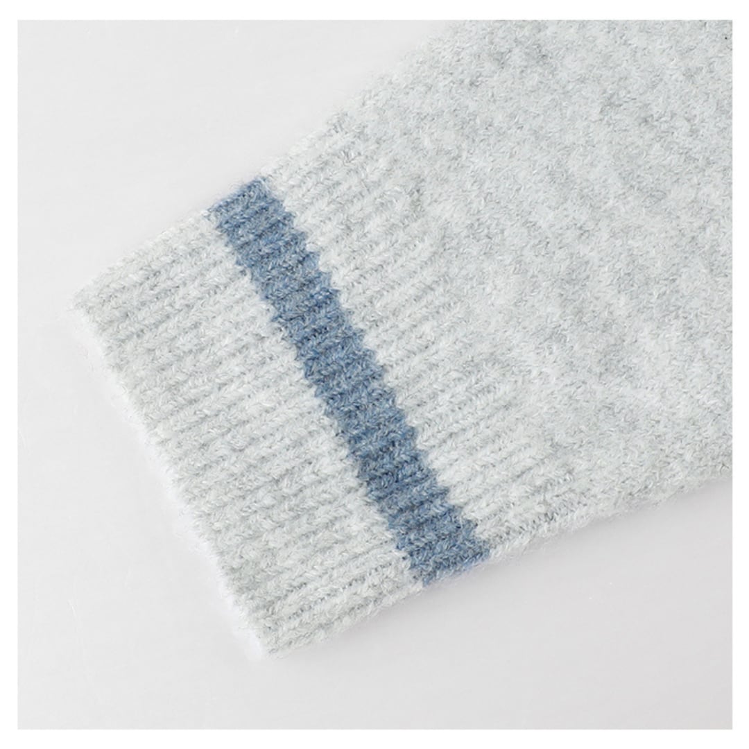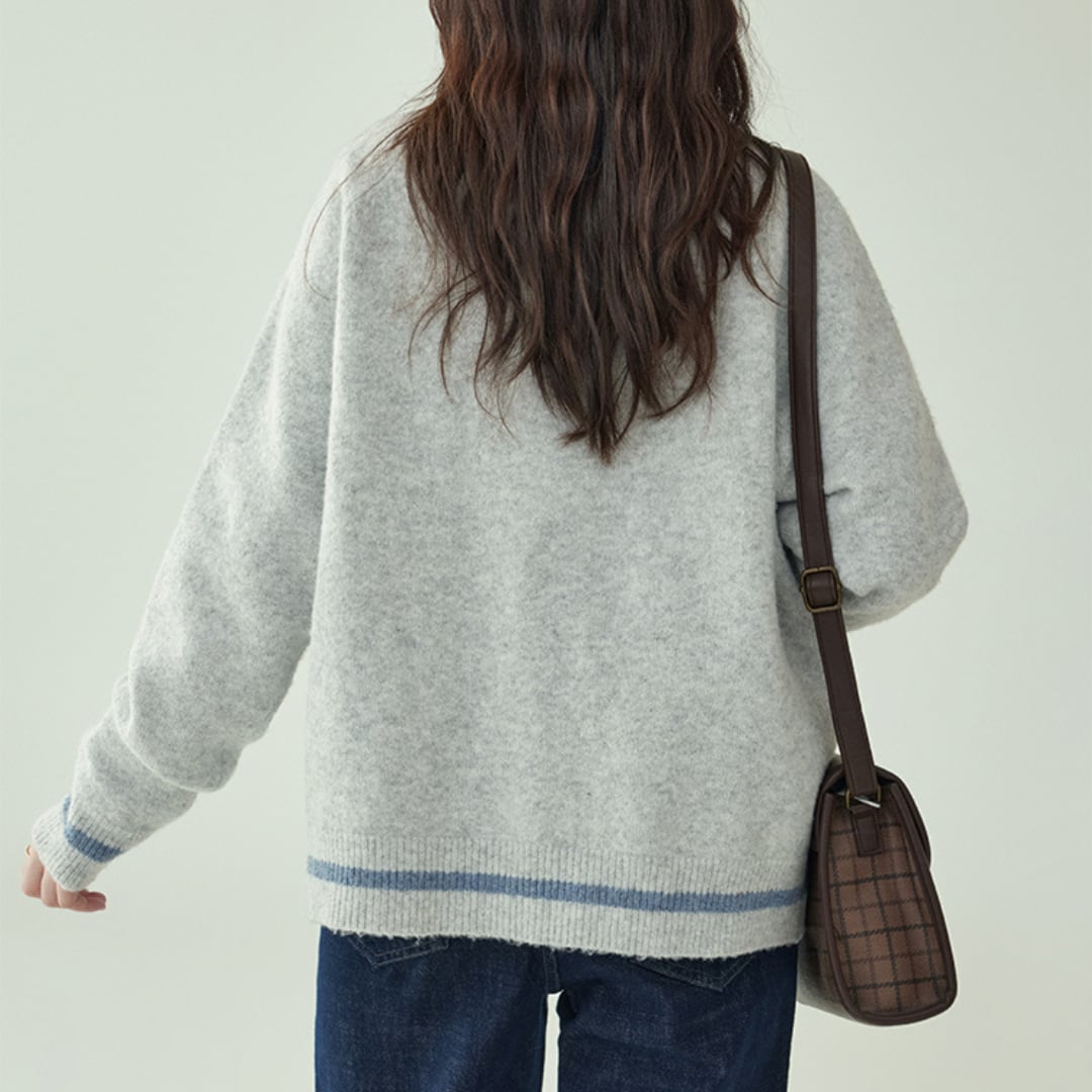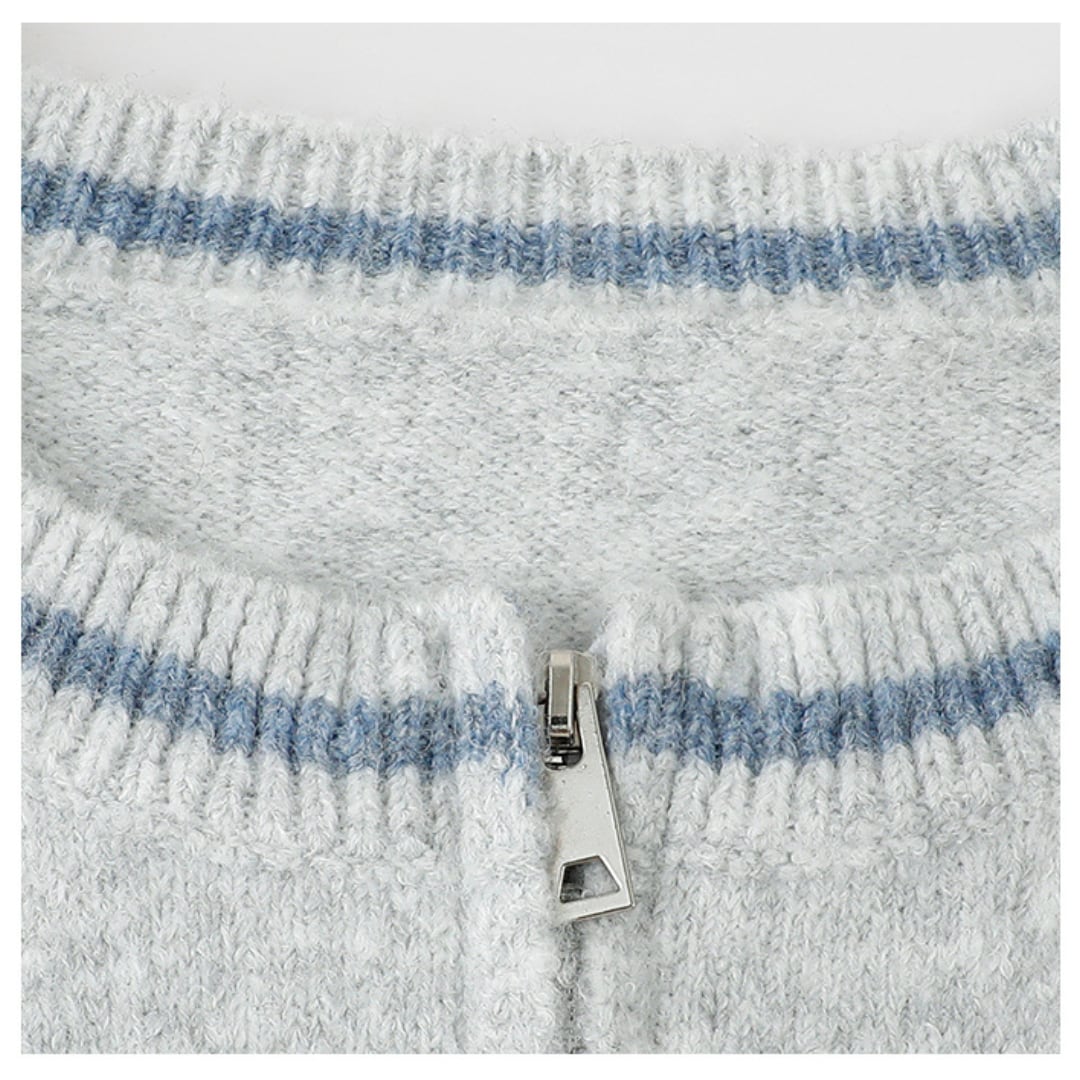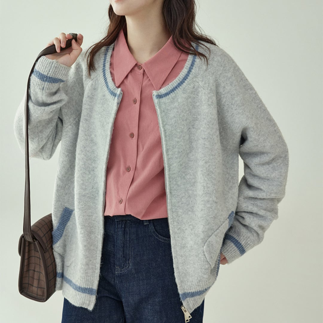 配色リブと丸みのあるシルエットが特徴のジップカーディガン。