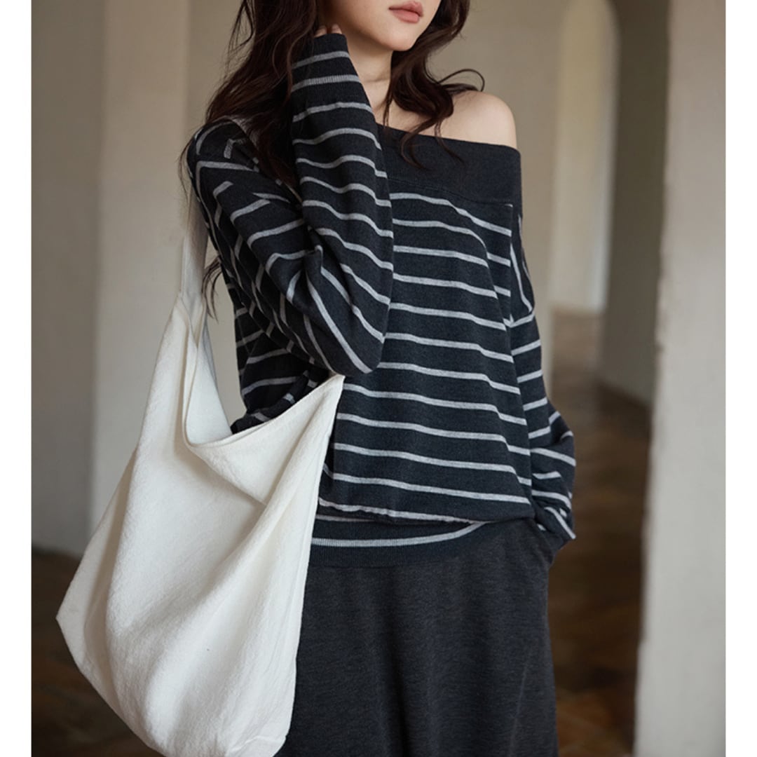 広めのネックラインとゆったりしたシルエットが抜け感を演出するボーダーニットトップス。