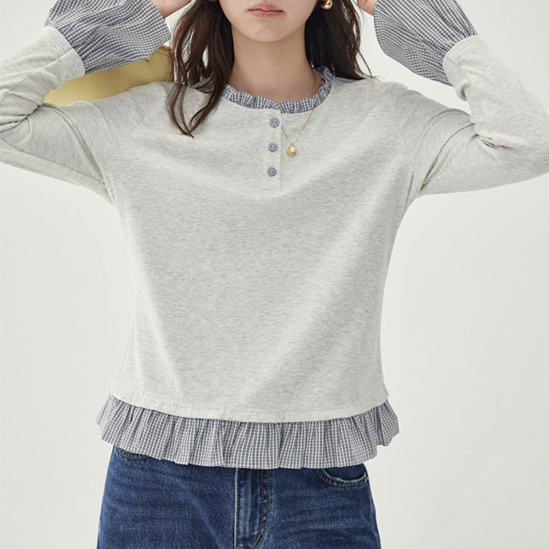袖口と裾に施されたギンガムチェックのフリルが、シンプルな中にも遊び心を添えるトップスです。 柔らかくストレッチの効いた生地で着心地もよく、秋のデイリーカジュアルにぴったりの一枚です。 【カラー】 グレー、ブルー 【サイズ】 S 着丈:56cm 胸囲:92cm 肩幅:38cm 袖丈:59cm M 着丈:57cm 胸囲:96cm 肩幅:39cm 袖丈:60cm L 着丈:58cm 胸囲:100cm 肩幅:40cm 袖丈:61cm モデル身長168cm 着用サイズM 【素材】 綿46%、ポリウレタン(スパンデックス)8% ♦︎選べるお支払い方法 ・クレジットカード決済(VISA/Master/JCB/AMEX) ・キャリア決済(docomo/au/Softbank/Y!mobile) ・Amazon pay(ご利用不可の期間あり) ・Pay-easy ・後払い決済 ✴︎ Erz. ranking top 10 ✴︎ こちらから↓ https://www.erzofficial.com/categories/3617358 [ pickup item]イチオシアイテム↓ https://www.erzofficial.com/categories/3558579 Erz.がご提案する大人のレトロカジュアルって? https://www.erzofficial.com/blog/2021/09/06/123341 【お届けについて】 こちらの商品は海外店舗より直接発送となる為、 ご入金から最短10日〜4週間前後で発送致します。 ◼️注意事項 ・タイミングによっては 商品在庫切れにより 注文キャンセルとさせていただく恐れもございますので、予めご了承くださいませ。 ・こちらは輸入品となります。日本製とは検品基準が異なる為、 ・新品未使用品でもごくわずかな汚れや ほつれがある場合もございます。 ・明らかな不良があった場合お手数ですが、お早めにご連絡をお願い致します。 ご確認後、ご返金、返品対応させていただきますのでご安心ください。 ・仕入れ工場を変えることがあるため、記載サイズと若干異なる場合がございます。 ・商品の色味は、お手持ちのスマートフォンの画面によって実物と若干異なる場合がございます。 ・イメージ違いやサイズ交換等、不良品以外の返品は対応出来かねます。 ・ご注文後のキャンセルは、ご遠慮いただいております。 ———————————— ご購入前にこちらをお読みください。 https://alroom.thebase.in/about 商品番号 TP270Y