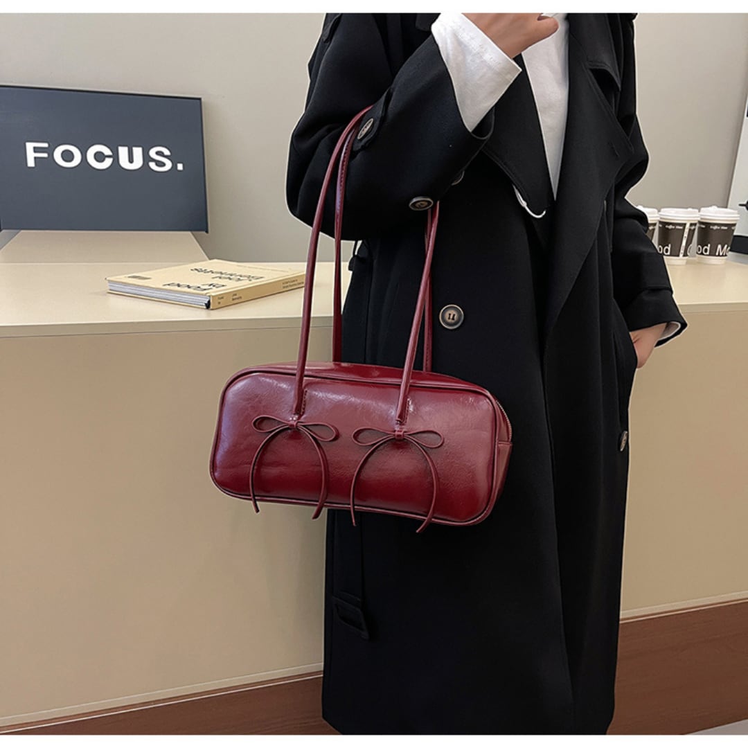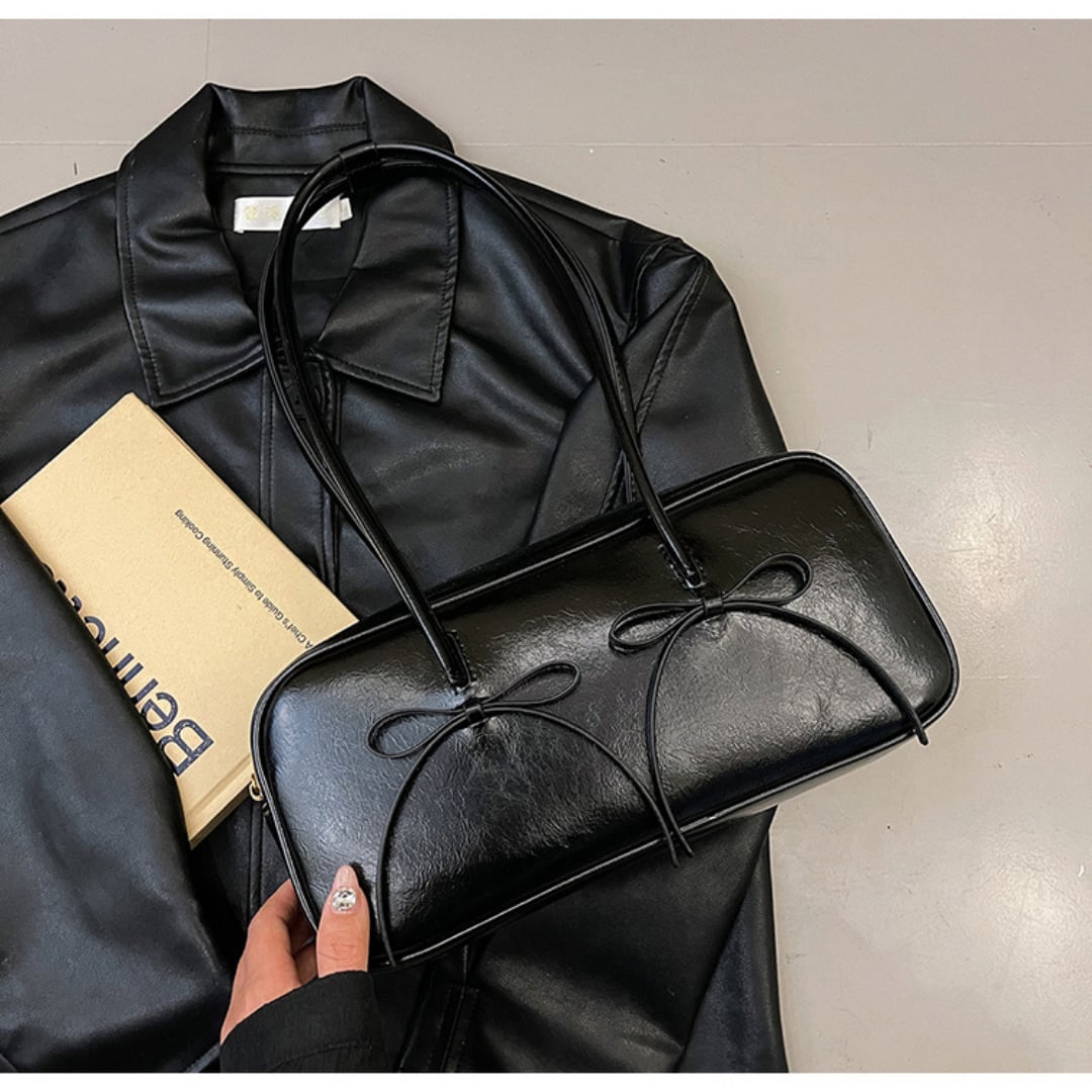 艶感のある素材にフロントのリボンがアクセントとなった、上品な印象のスクエアバッグです。