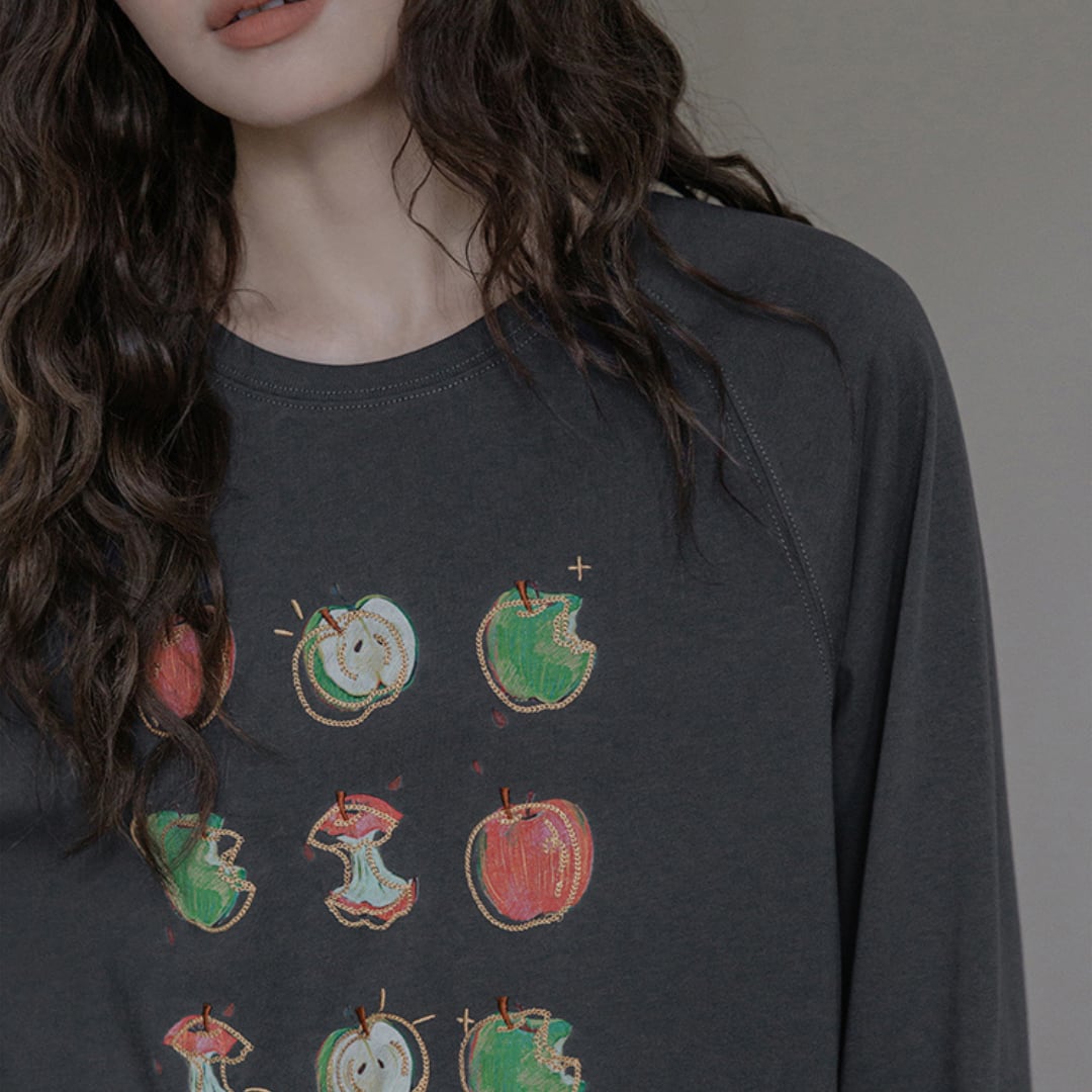 遊び心あるリンゴモチーフの刺繍とプリントが目を引く、ゆったりシルエットのスウェットトップス。