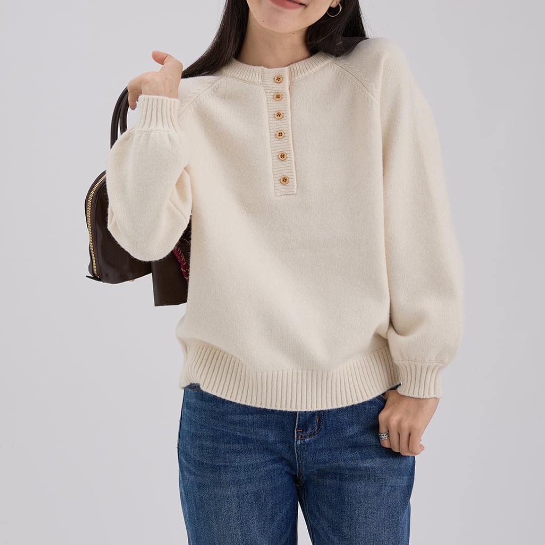 クラシカルな木調ボタンとやわらかいウール混素材が魅力のラグランスリーブプルオーバー。