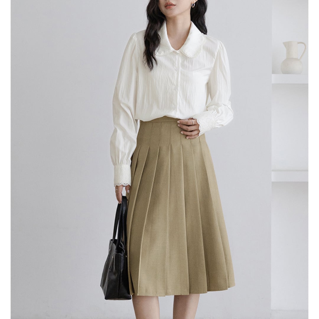 スカラップレースの襟と袖口の刺繍ディテールが、上品でクラシカルな印象を与えるブラウス。