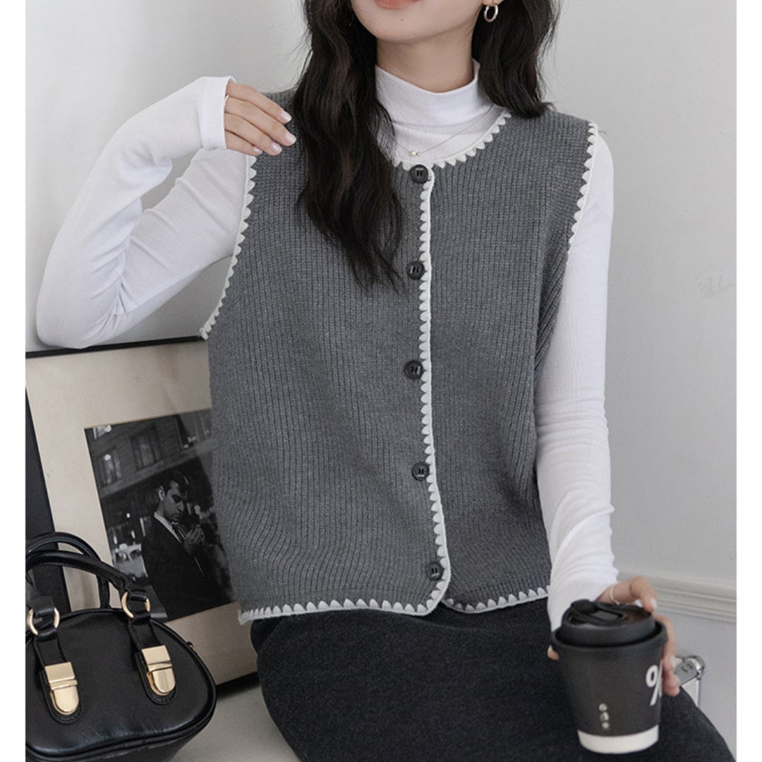 フロントボタンと縁取りがアクセントになった、シンプルながら目を引くニットベストです。
