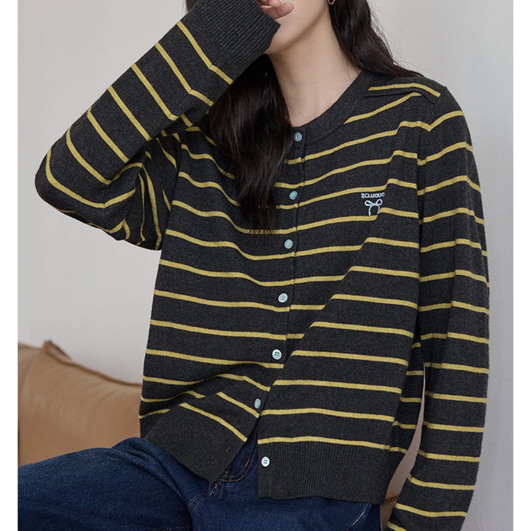 やわらかな風合いとボーダー柄が魅力の、ラウンドネックのボタンカーディガン。