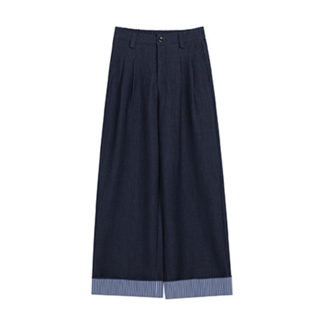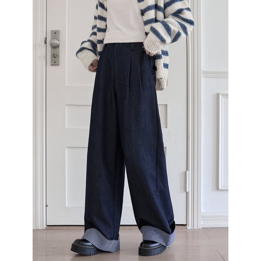 ストライプ柄の折り返し裾がアクセントになった、トレンド感あるワイドデニムパンツ。