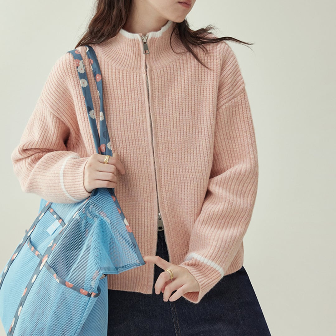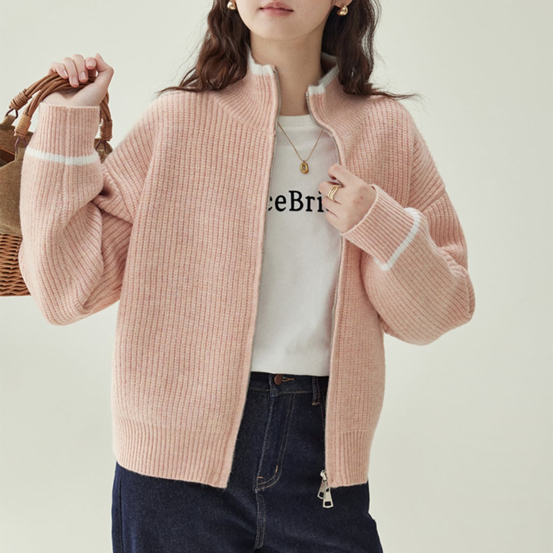 首元まで暖かく包み込むスタンドカラーと、袖や裾にあしらわれた配色ラインがアクセントのジップアップニット。