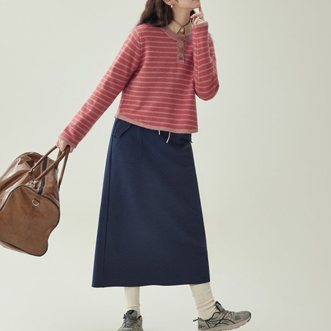 ナチュラルな牛角風ボタンがアクセントの、温かみあるボーダーニット。