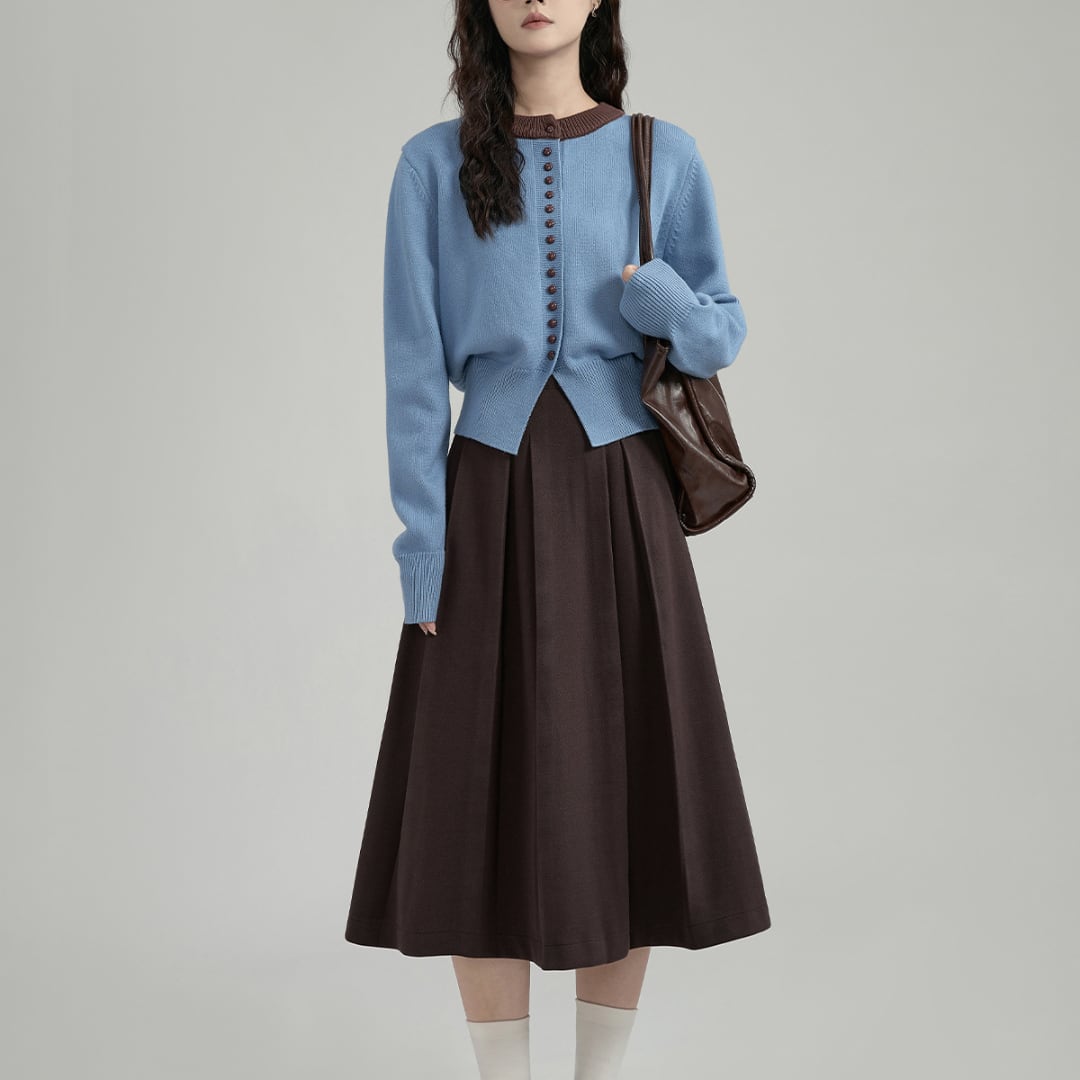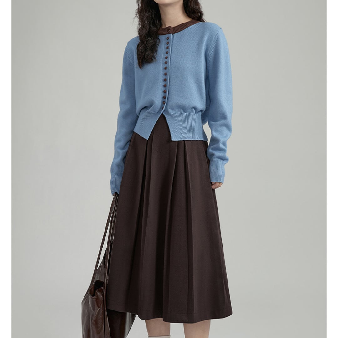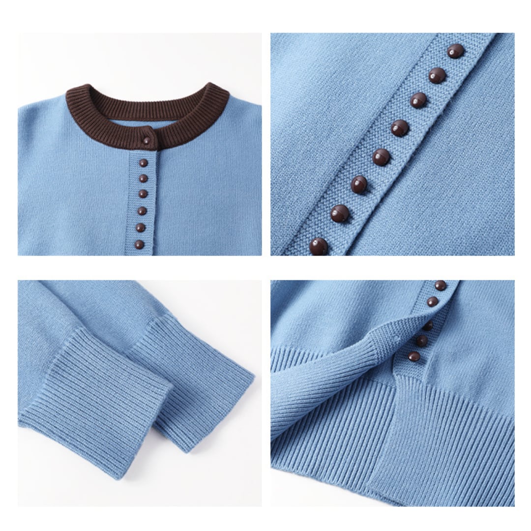 フロントに並ぶボタンとバイカラーデザインが印象的な、ラウンドネックのニットカーディガン。
