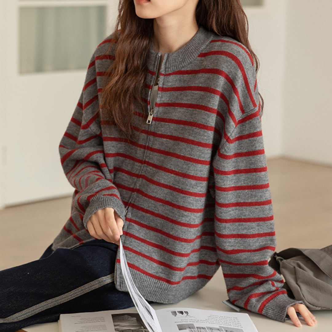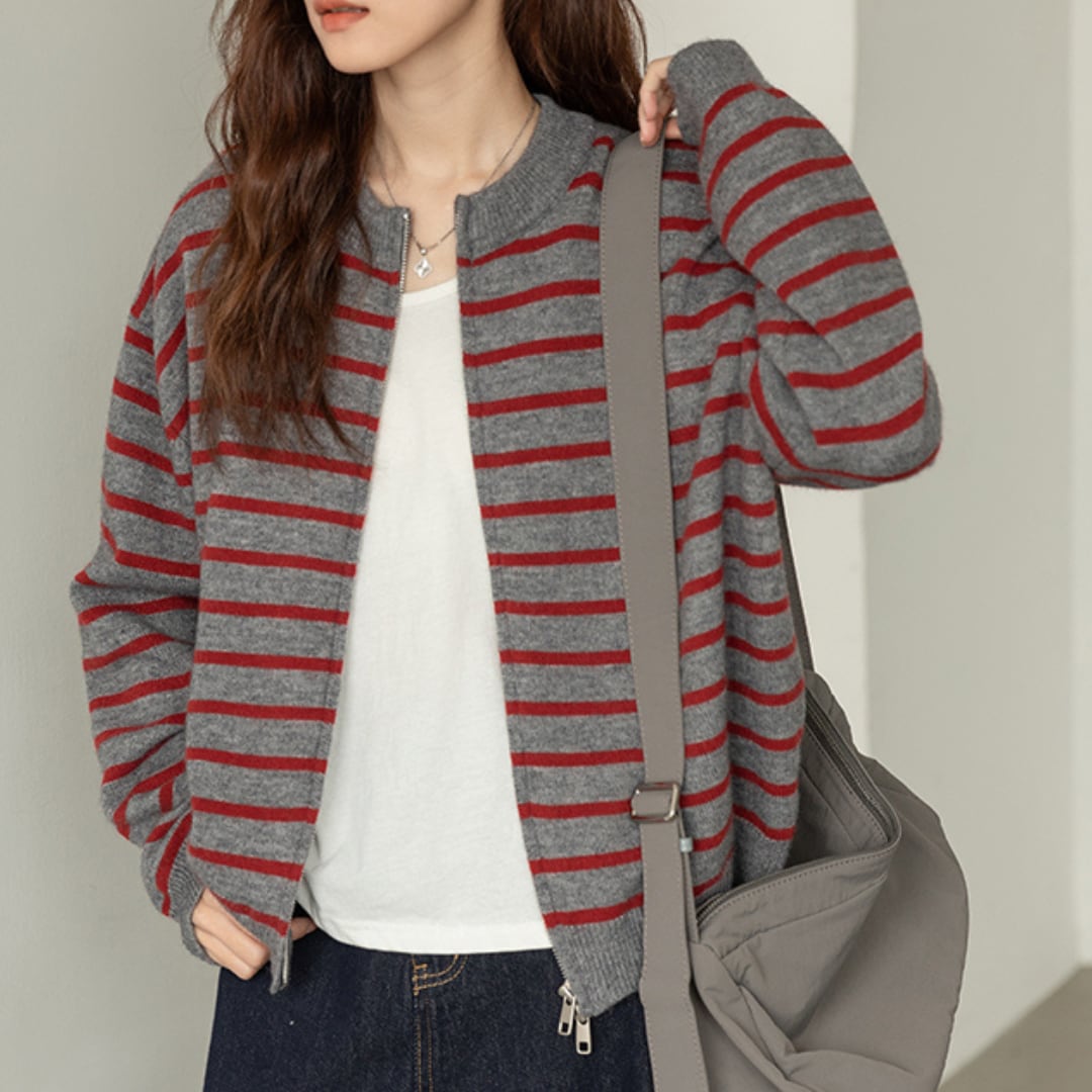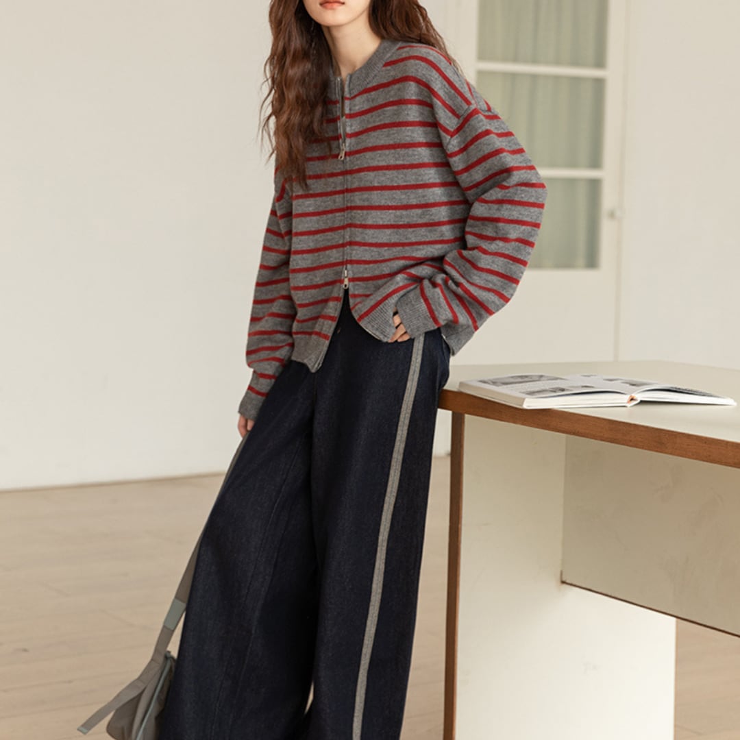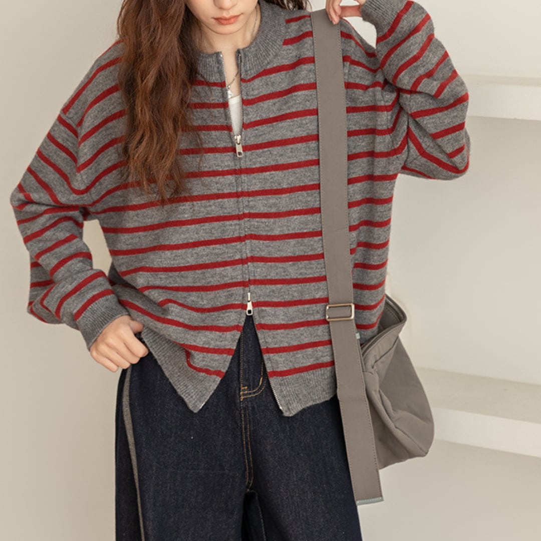 存在感のあるボーダー柄にダブルジップを組み合わせた、カジュアル感漂うニットカーディガン。