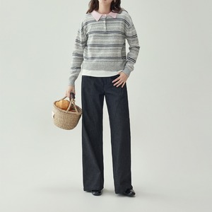 配色の丸襟がアクセントになったボーダーニットプルオーバーは、柔らかく優しい印象を与えるデザインが魅力です。