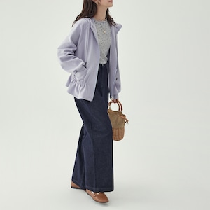 ウエスト部分にギャザーを寄せた裾フリルがポイントの、ジップアップ仕様のフーディー。
