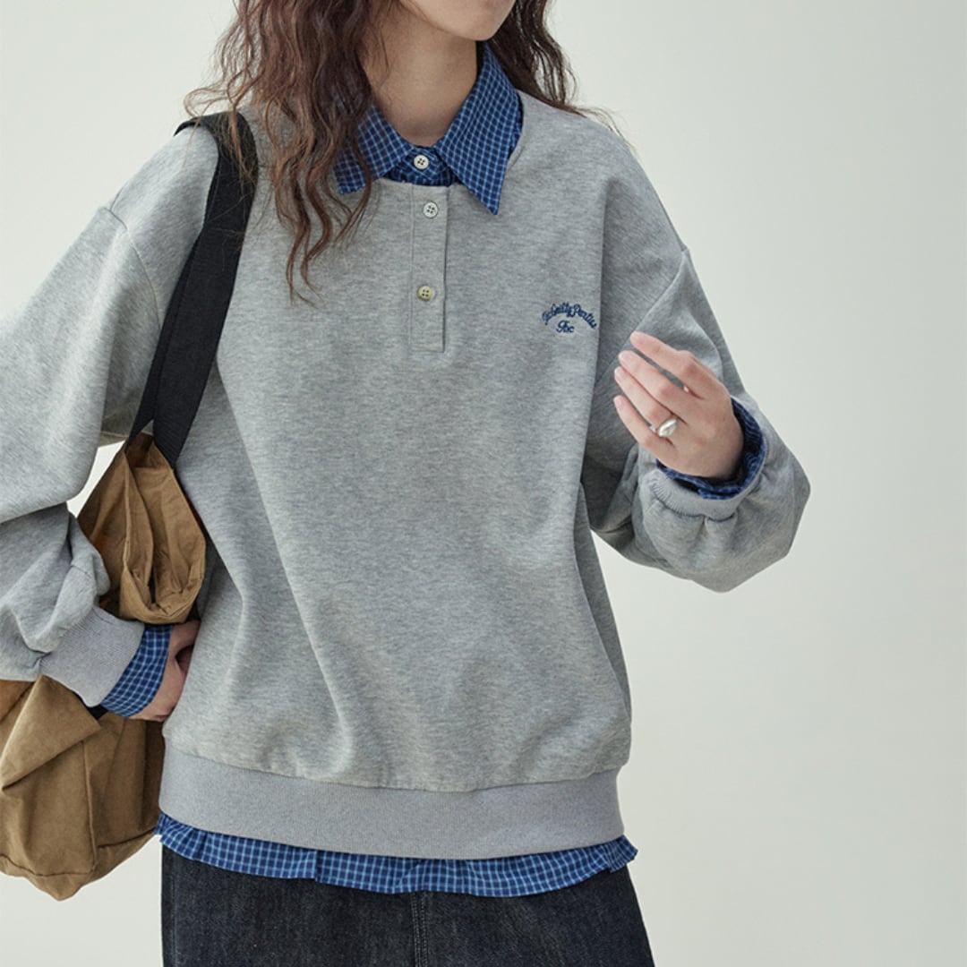 チェック柄シャツをレイヤードしたようなデザインが魅力の、刺繍アクセント付きスウェットトップス。