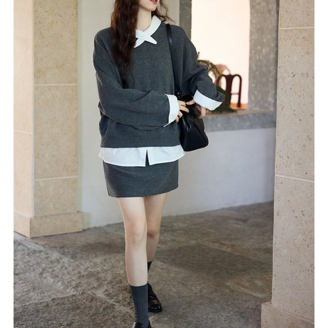 襟元と裾からのぞくレイヤードデザインがアクセントのスウェットとスカートのセットアップ。