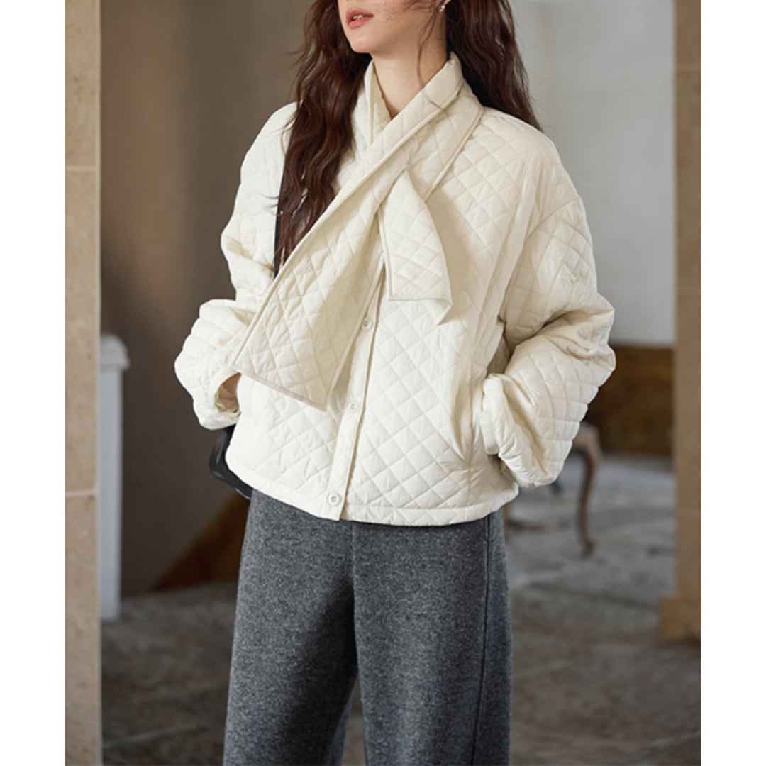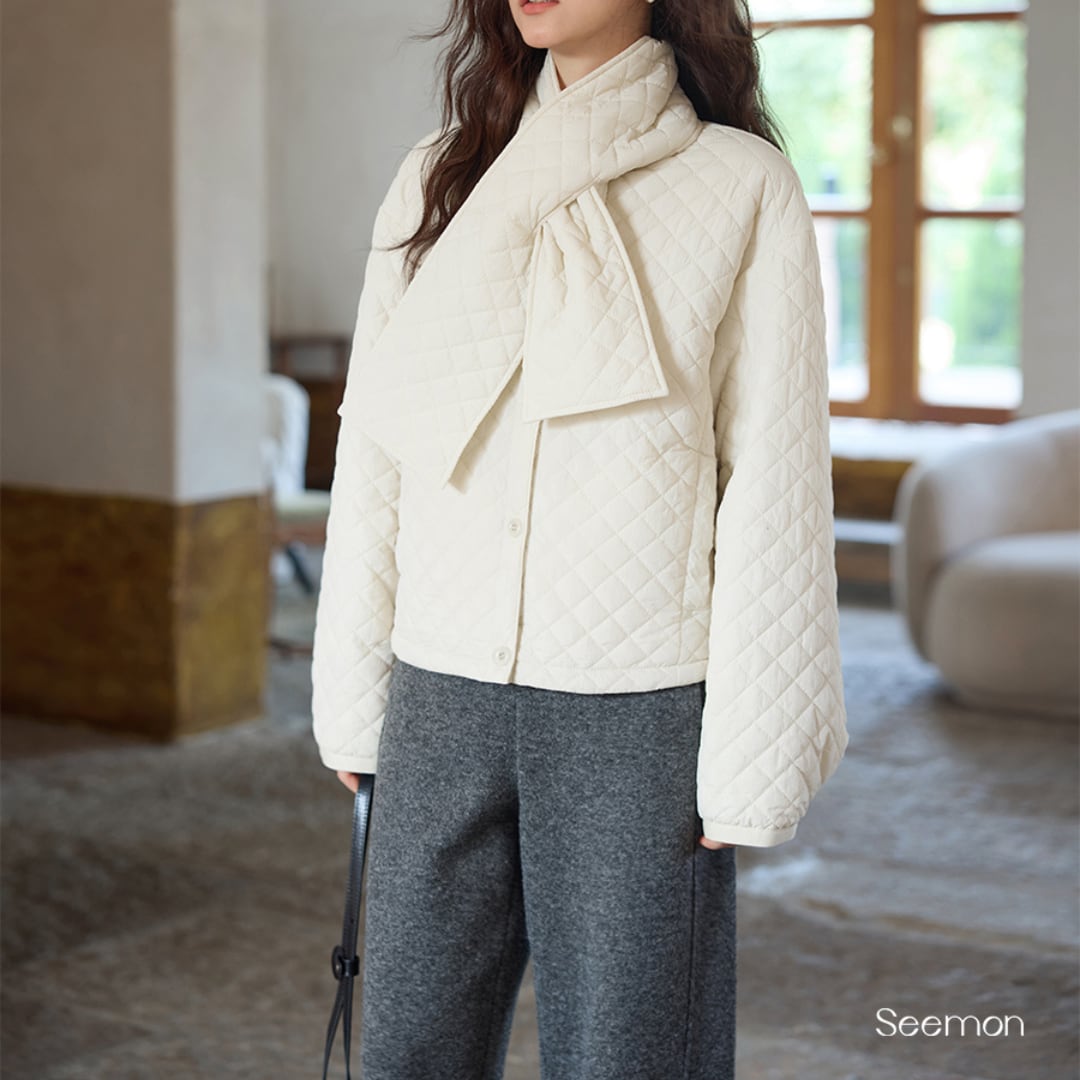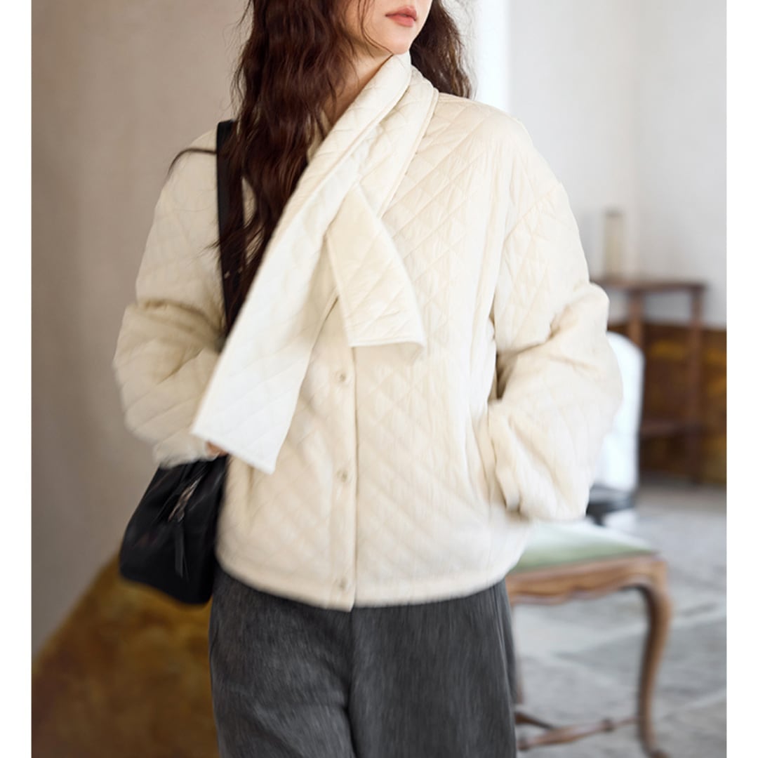 立体的なキルティングとスカーフ風ディテールが目を引く中綿ジャケット。