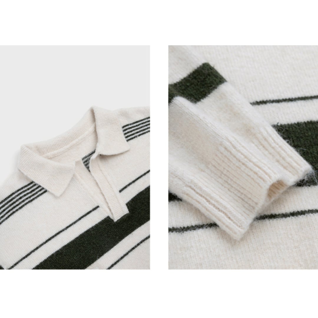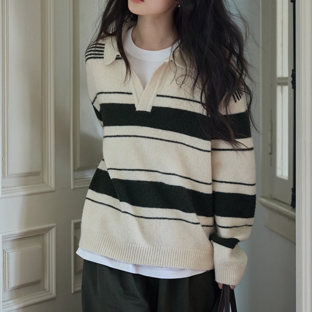ナチュラルなボーダー柄と配色デザインが魅力の、ポロカラーのニットプルオーバー。ゆったりとしたシルエットで一枚でもレイヤードでも着回しやすく、秋冬のカジュアルスタイルにぴったりです。