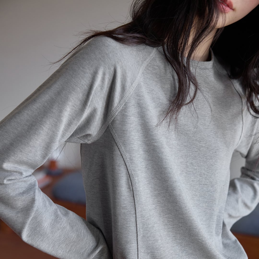 シンプルながら立体的な縫製ラインとラグランスリーブが特徴の、ミニマルな長袖カットソー。やわらかく伸縮性のある素材で、秋冬のインナー使いや一枚着としても快適に着回せます。