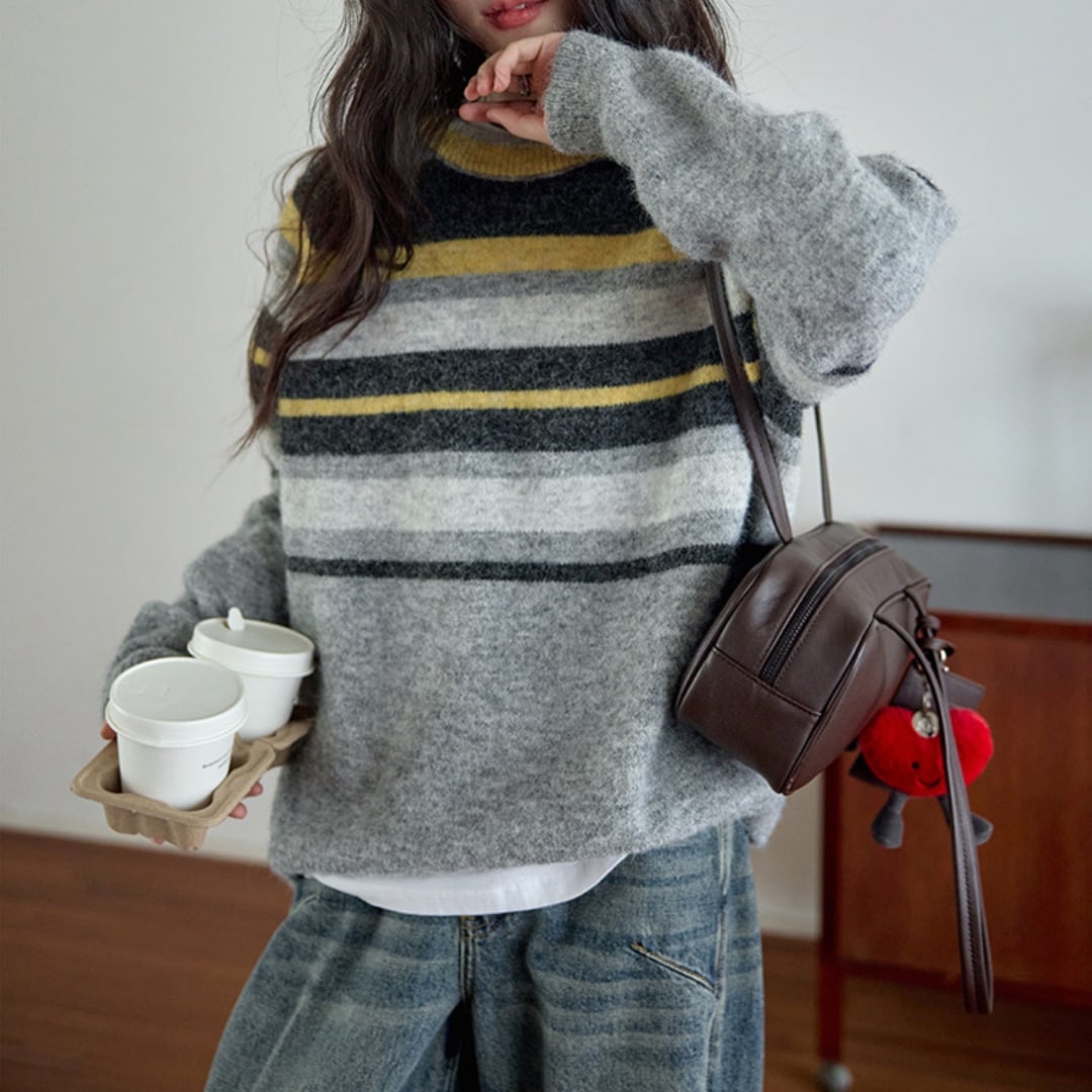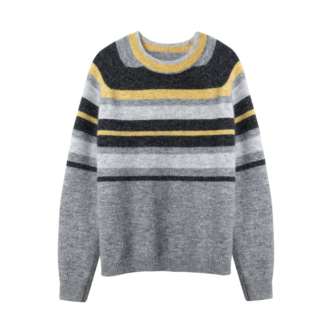 柔らかな肌触りと程よい厚みが魅力のボーダーニットは、カジュアルながらも落ち着いた配色で大人の着こなしにマッチします。ゆったりシルエットで着心地も良く、秋冬のデイリー使いに重宝するアイテムです。