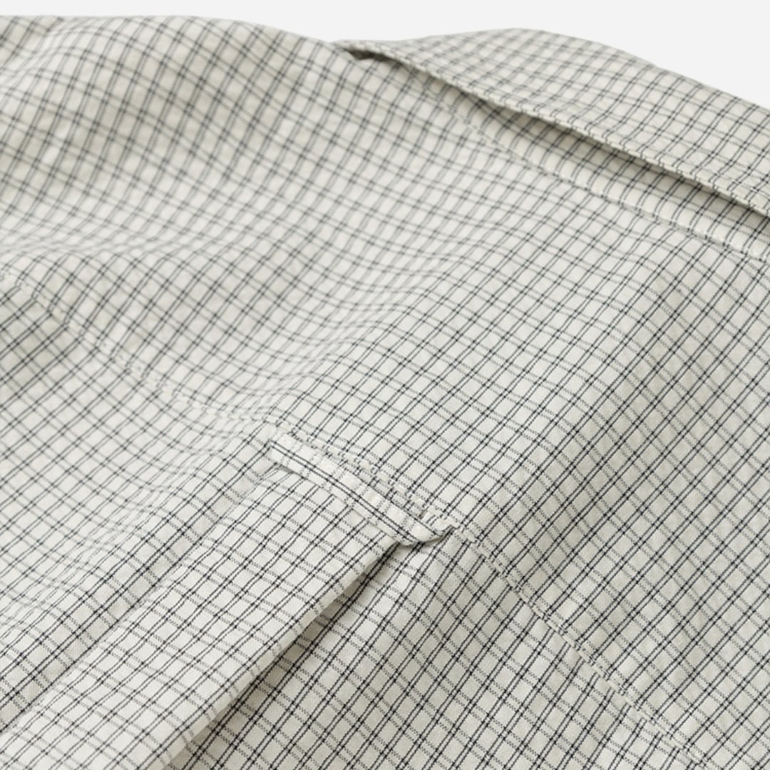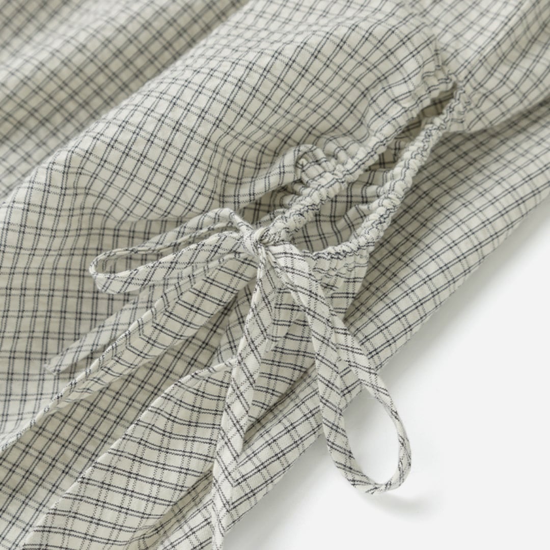 裾のドローストリングでシルエット調整ができる、ゆったりシルエットのチェック柄シャツ。