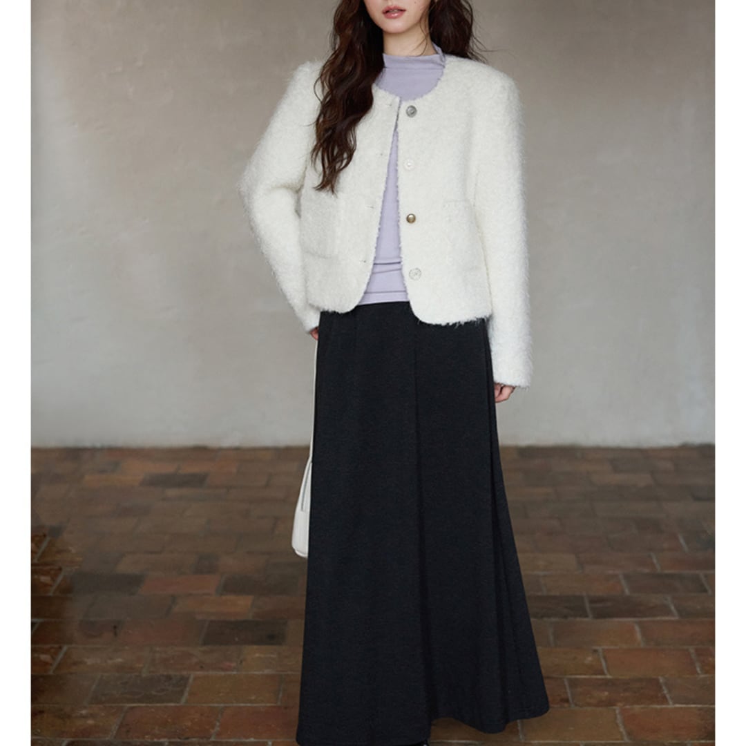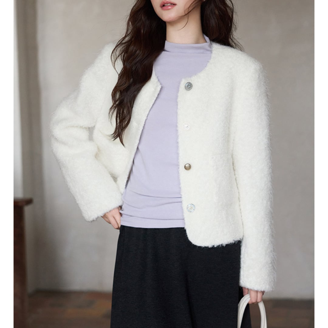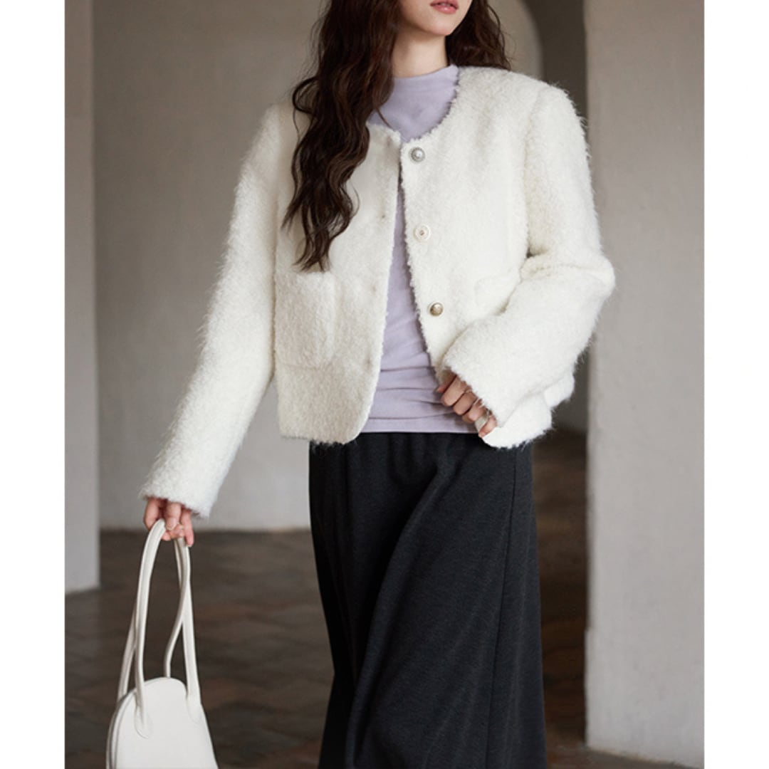 ふんわりとしたシャギー素材と個性的なループボタンが目を引く、柔らかな印象のショートジャケット。