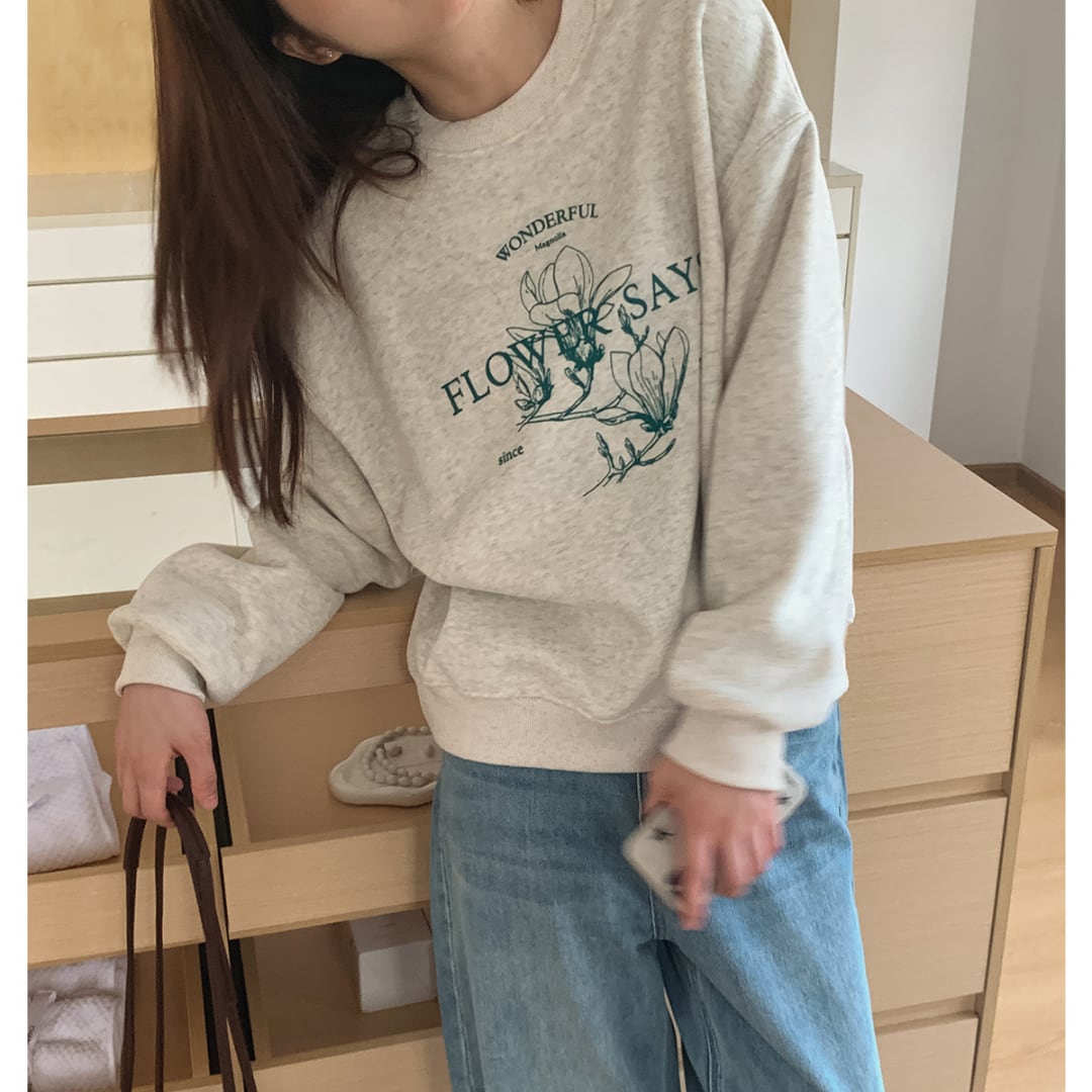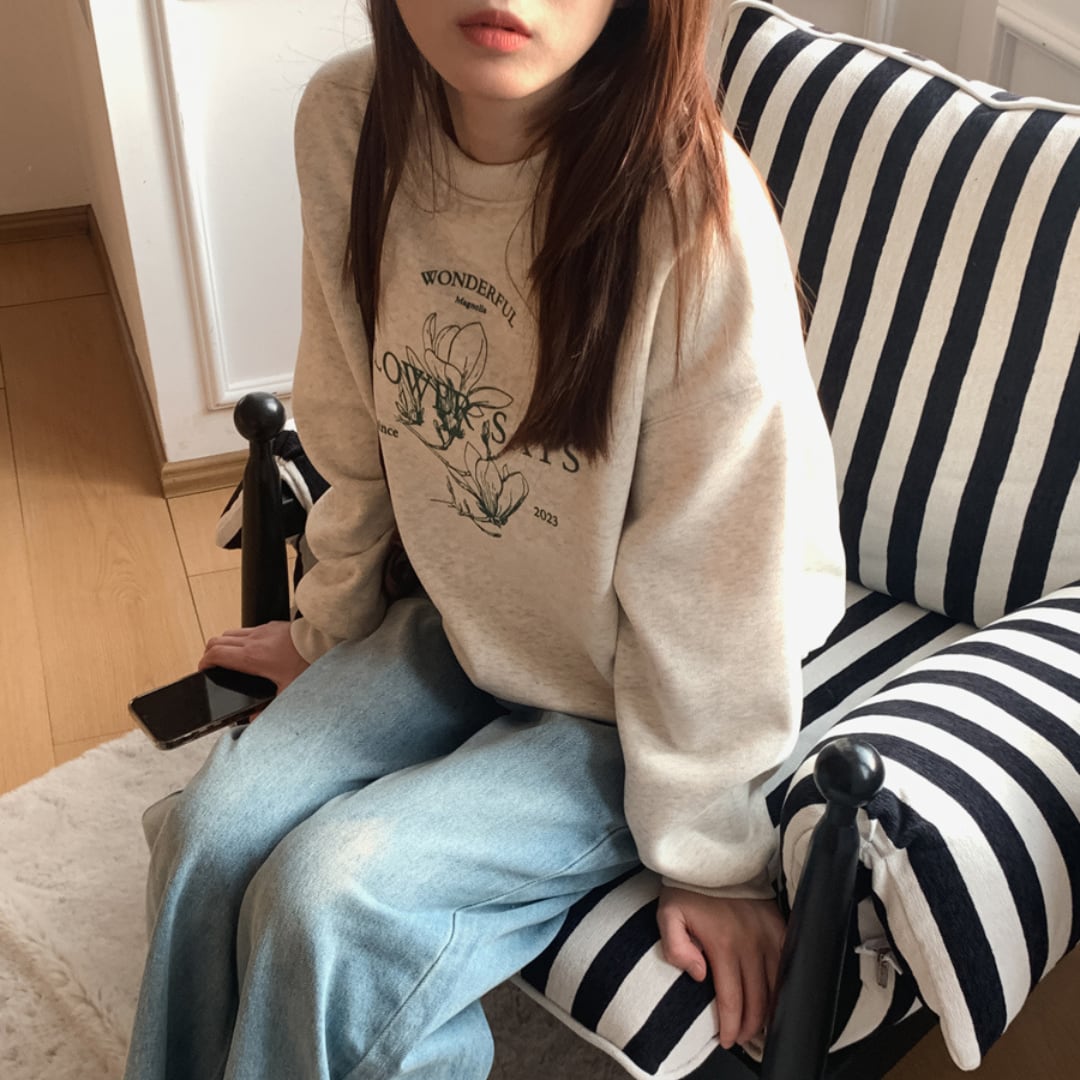 繊細なフラワープリントがフロントに映える、ゆったりとした着心地の裏起毛スウェット。