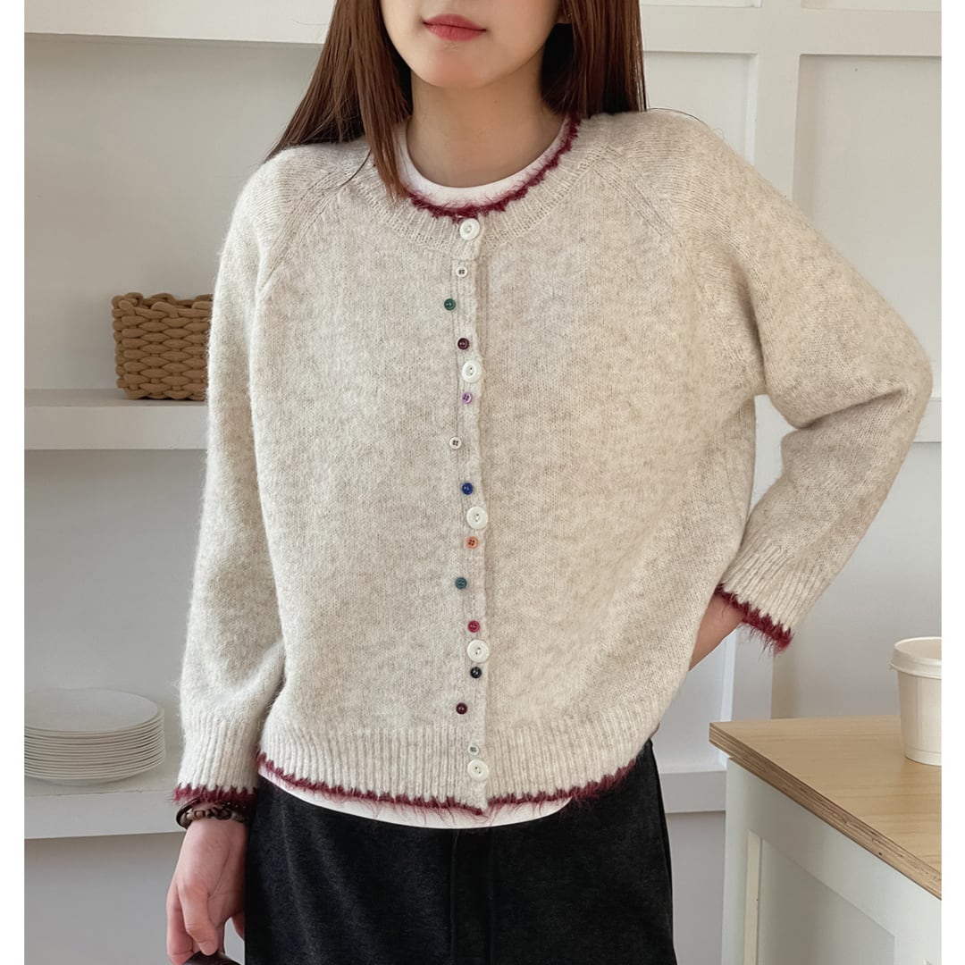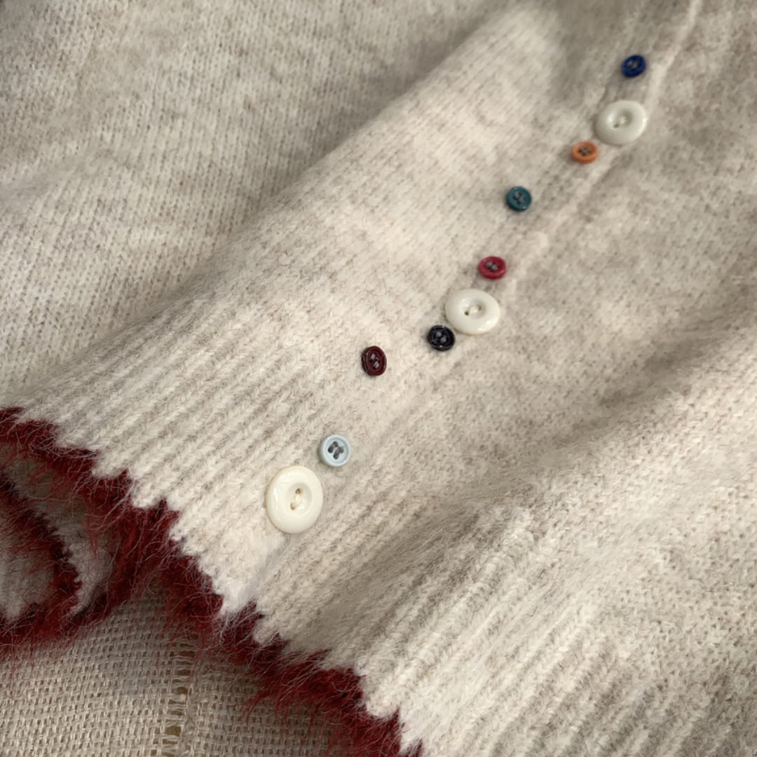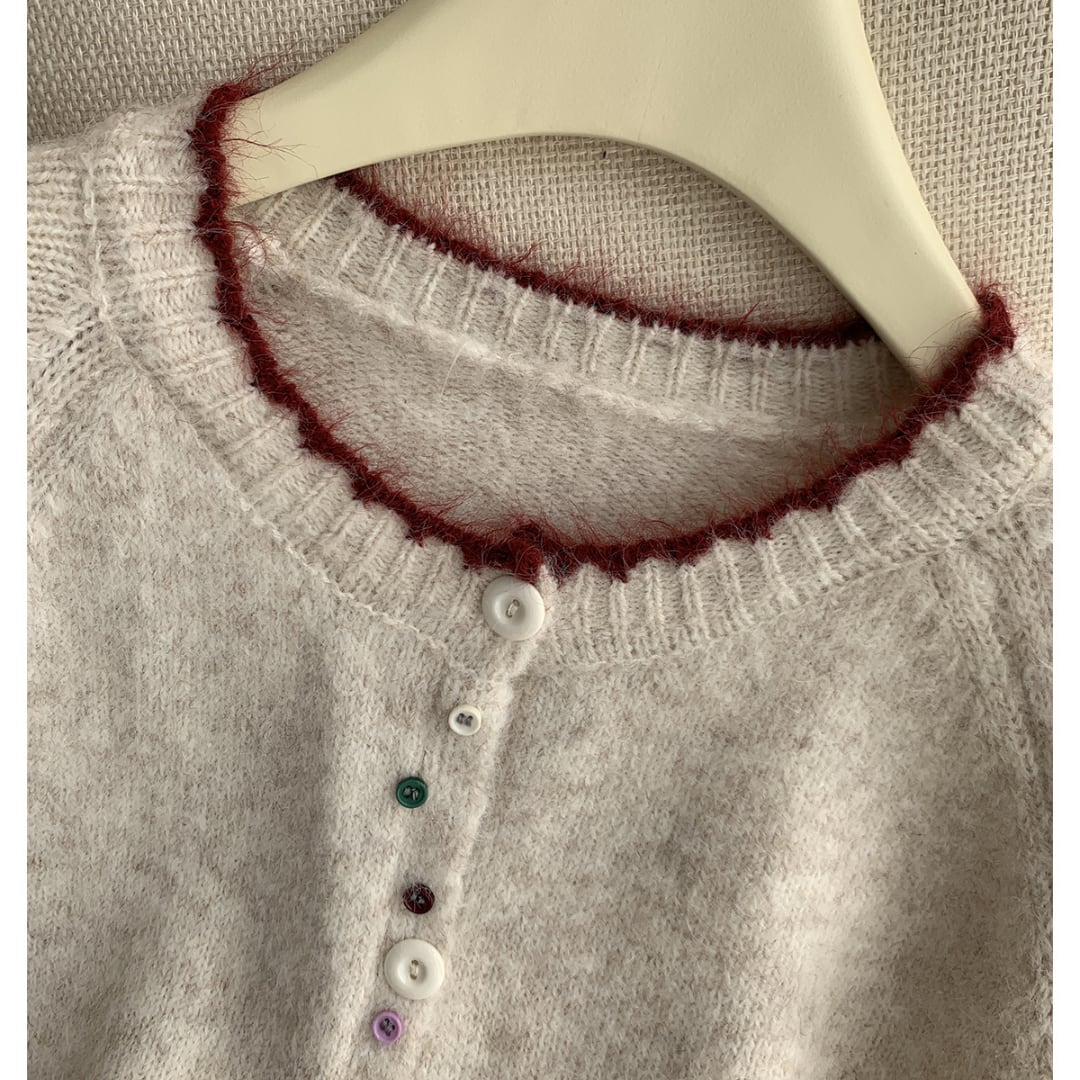 カラフルなボタンと赤の縁取りがアクセントになった、ふんわりとした風合いのニットカーディガン。