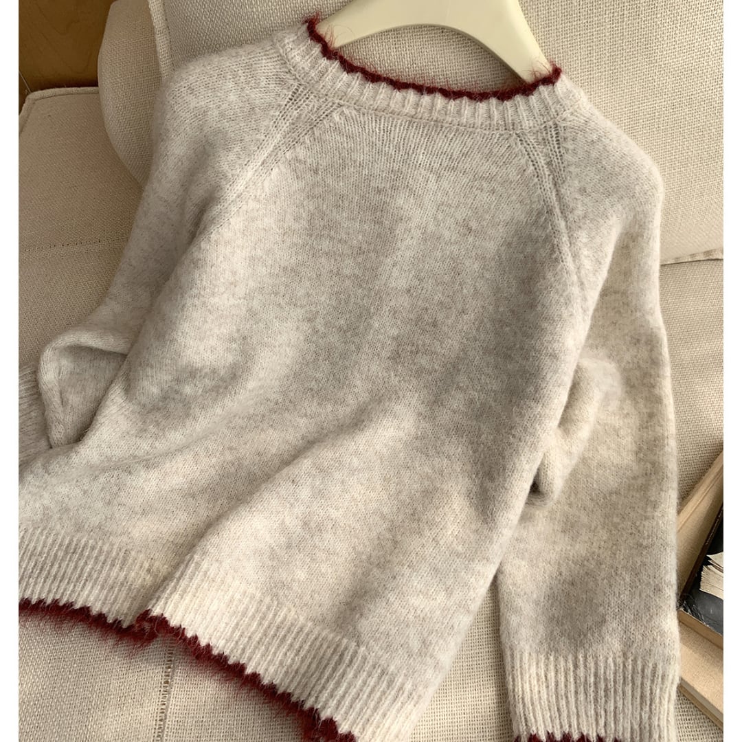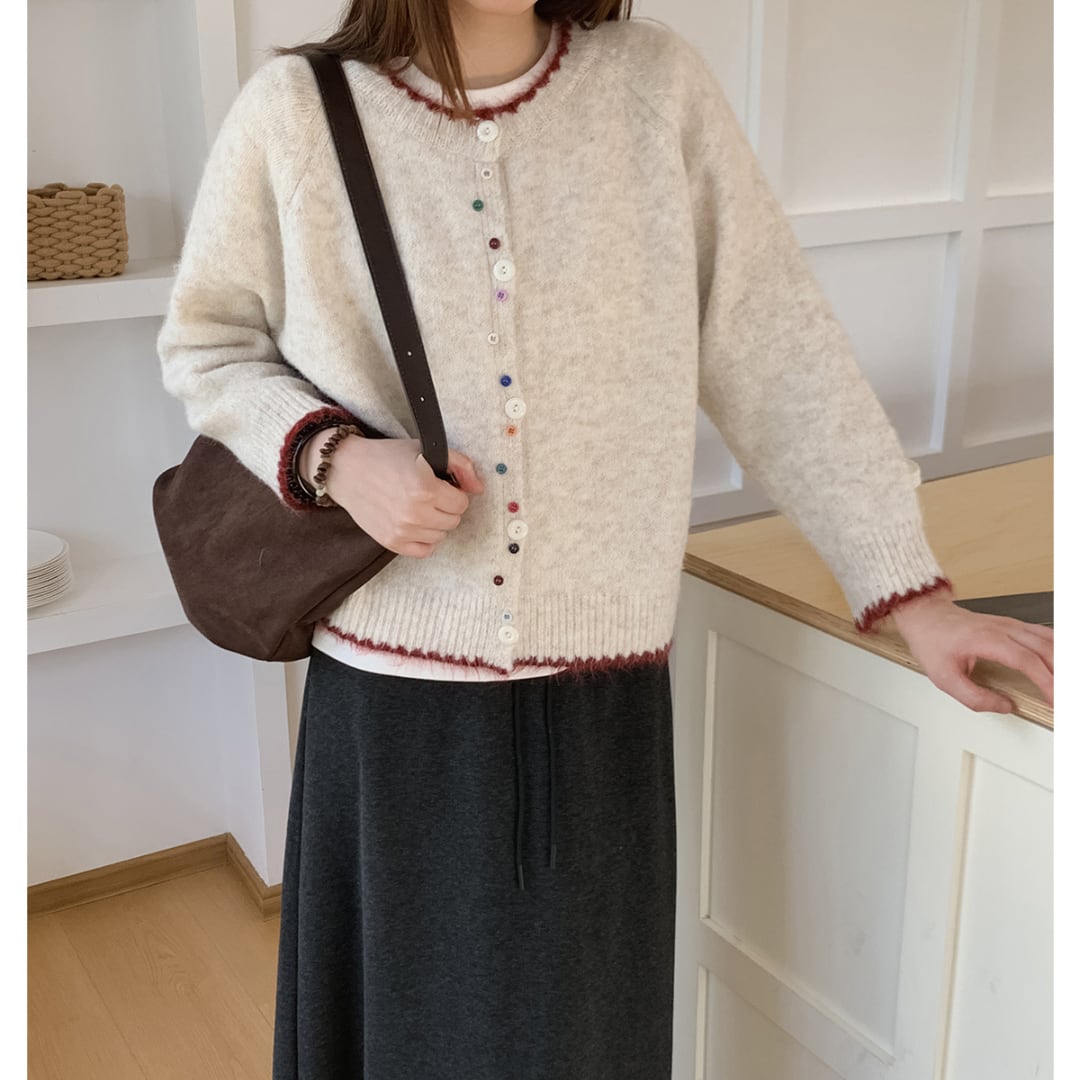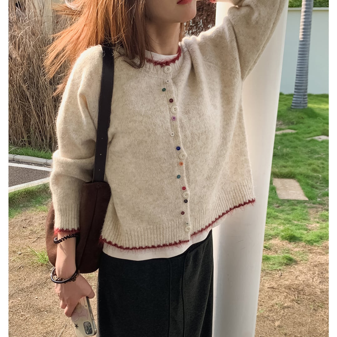 カラフルなボタンと赤の縁取りがアクセントになった、ふんわりとした風合いのニットカーディガン。