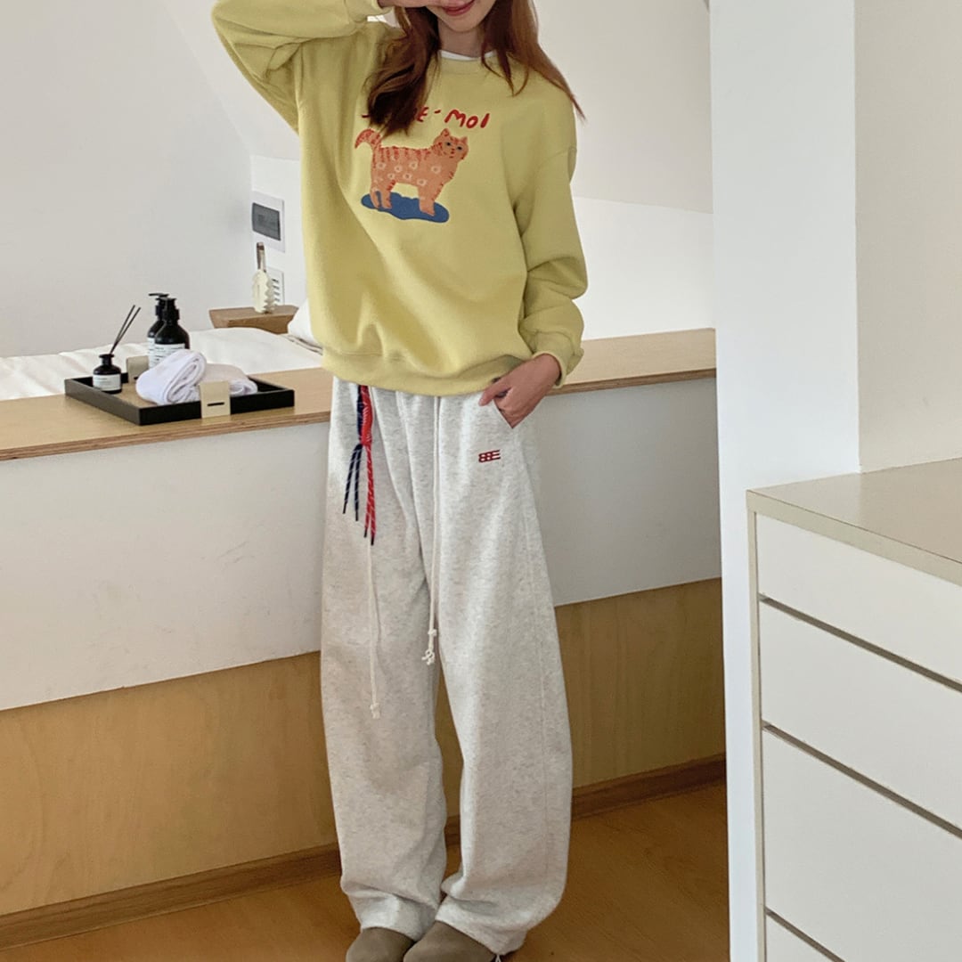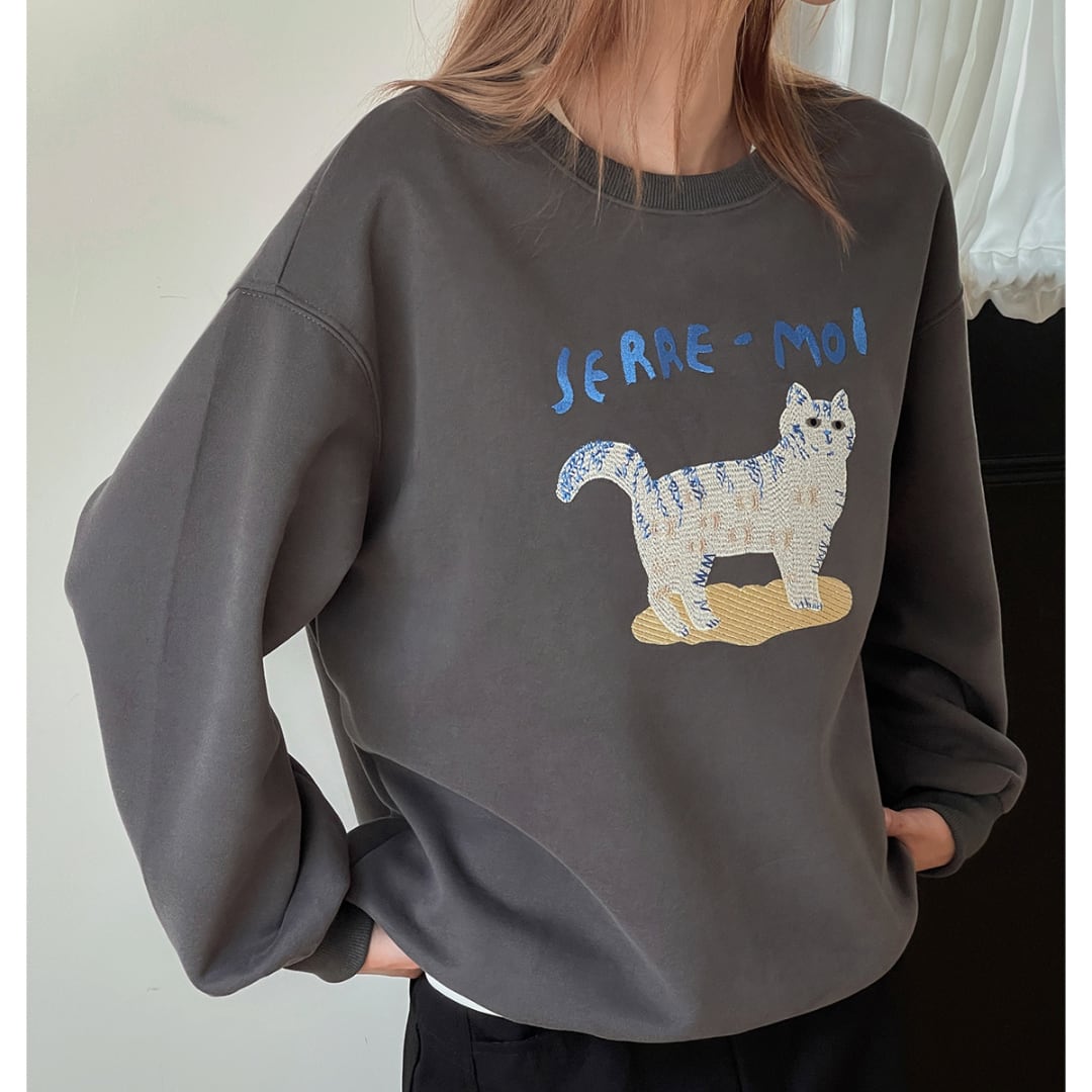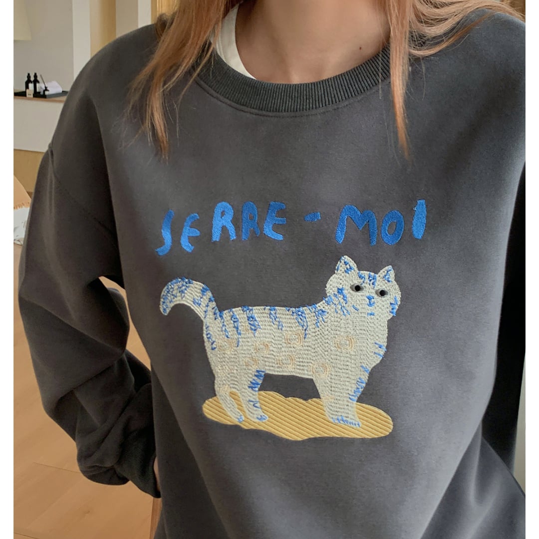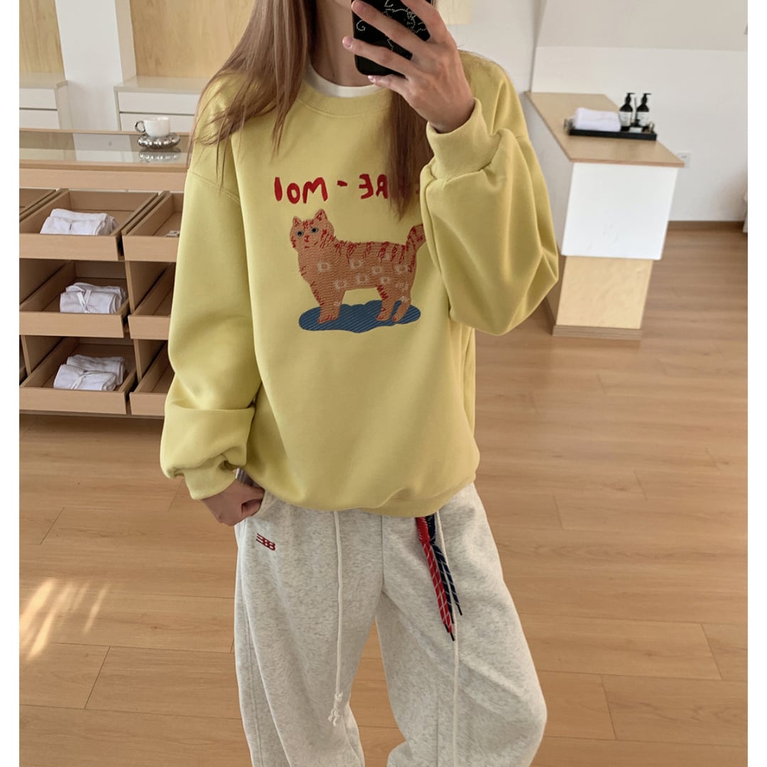 愛らしい猫のイラストがプリントされた、柔らかな風合いのゆったりスウェットトップス。
