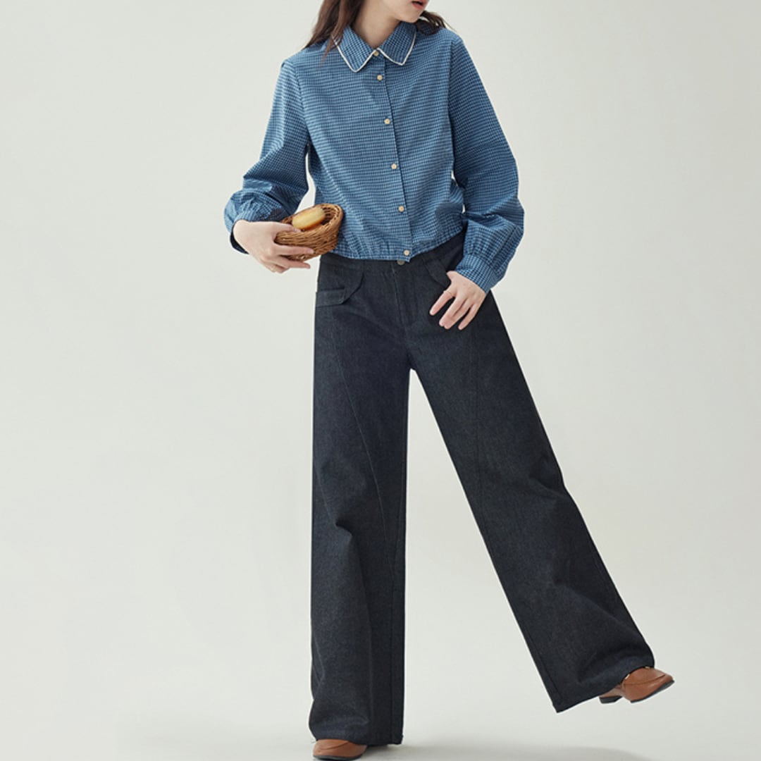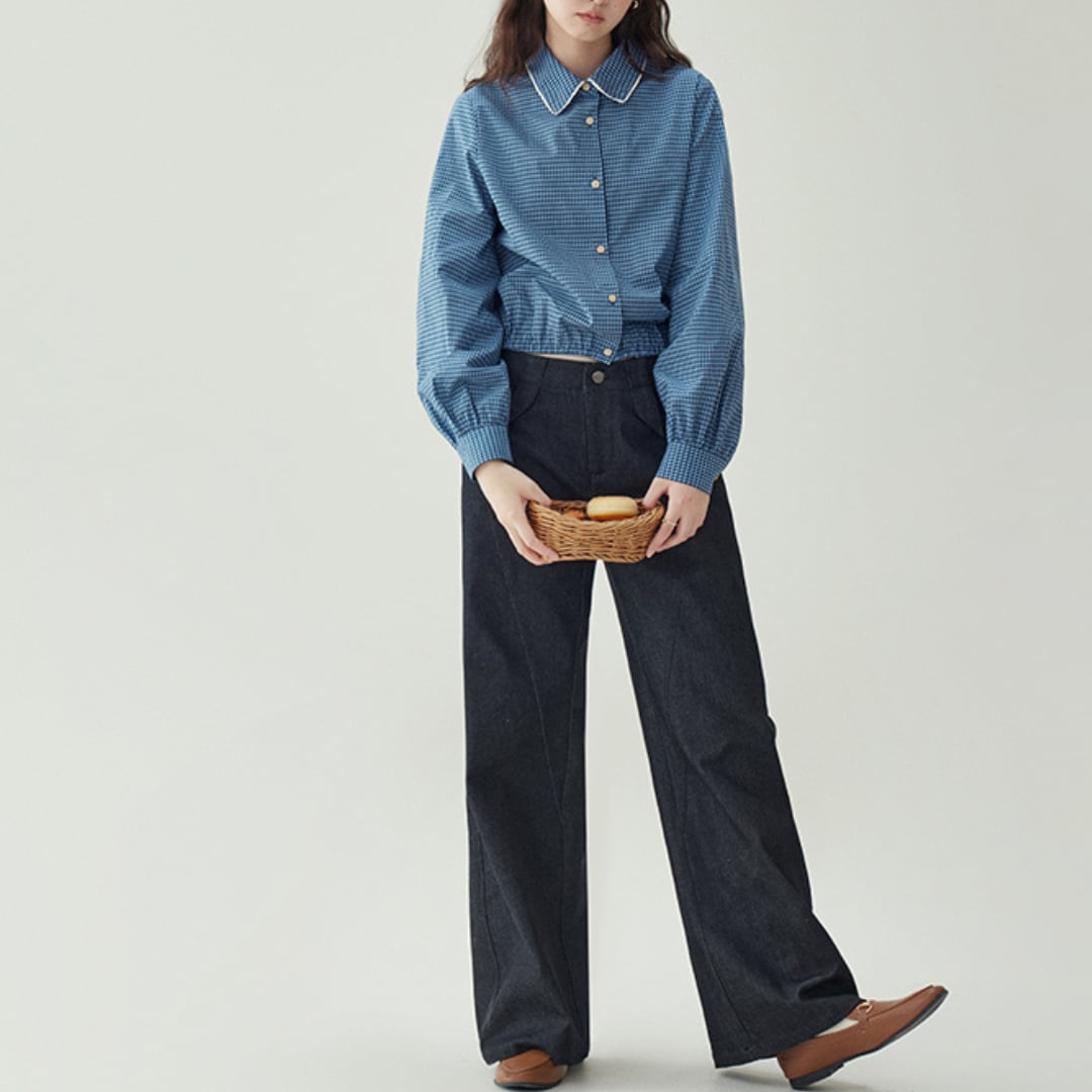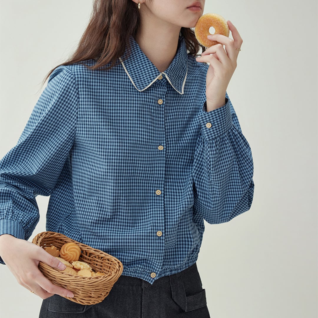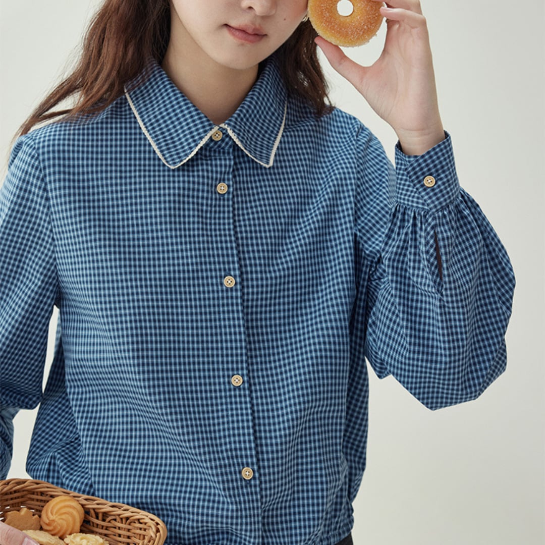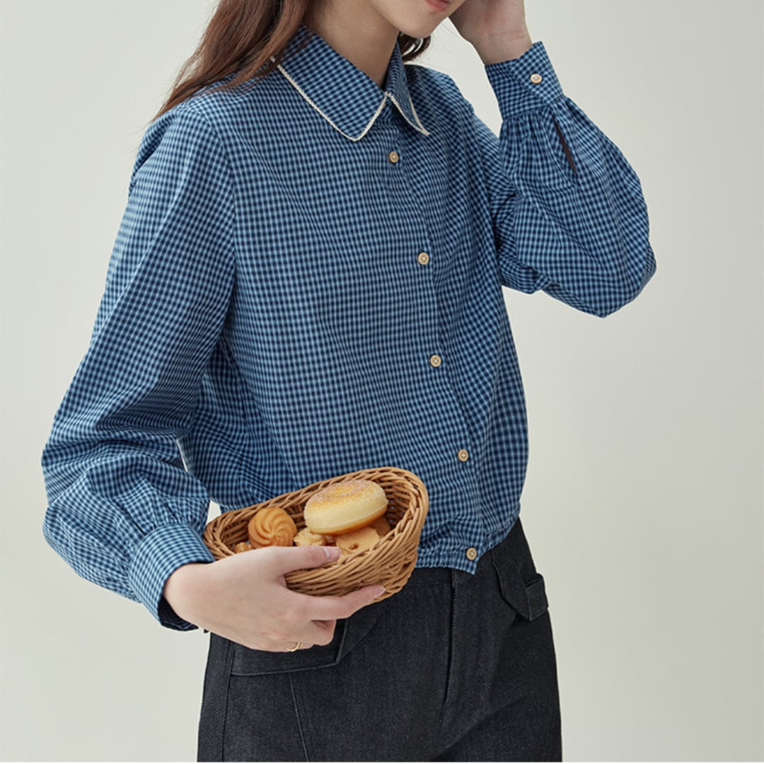 コントラストの効いた配色パイピングと丸みのあるシルエットが魅力のチェックシャツ。