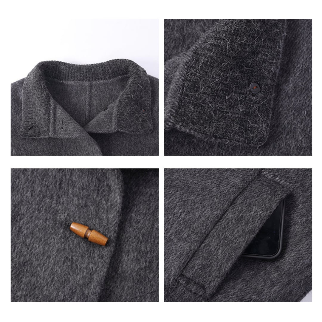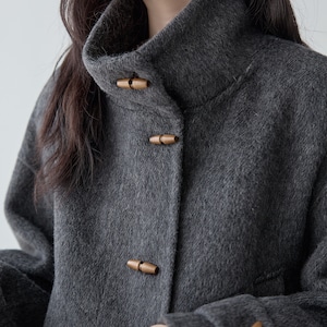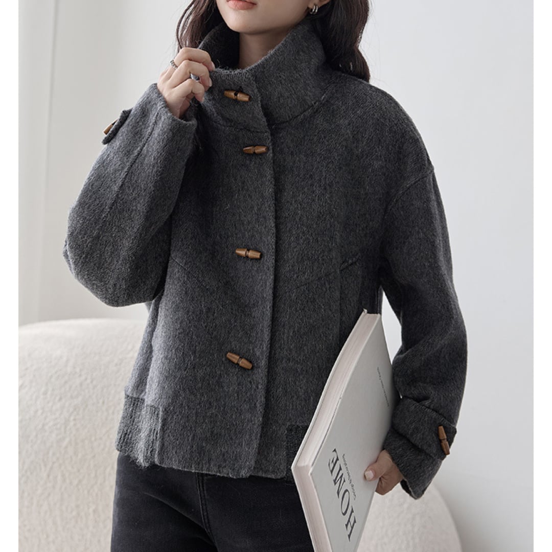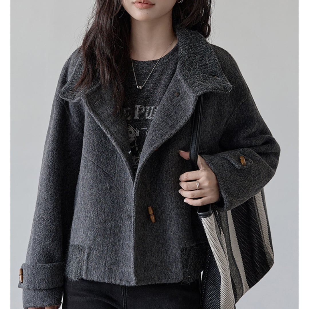 異素材の切り替えデザインとトグル風ボタンが印象的な、ショート丈のウール風ジャケット。