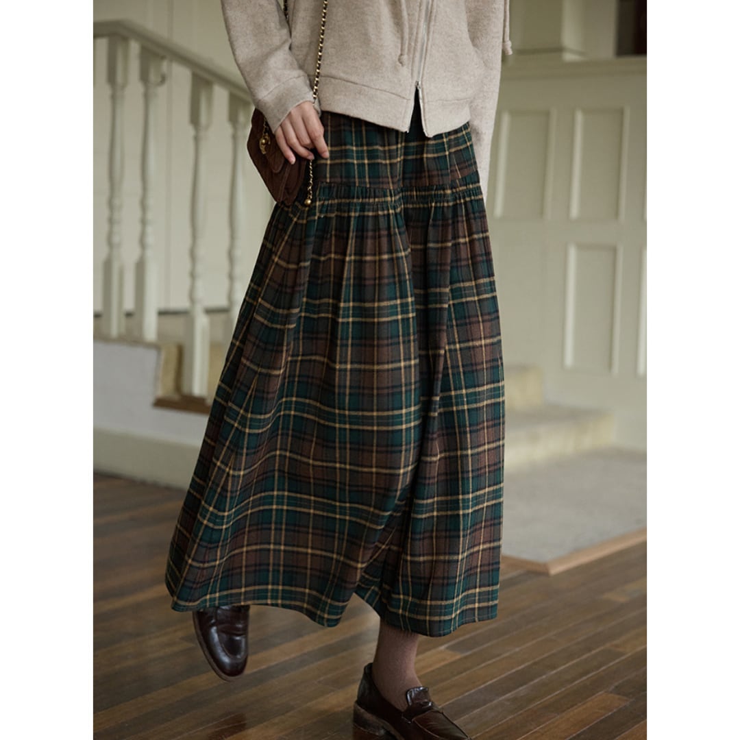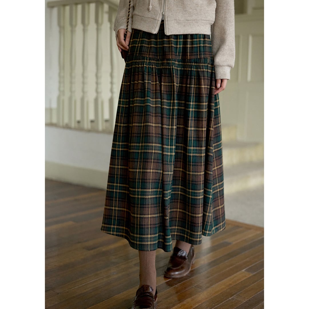 たっぷりとしたギャザーが動きに表情を与える、高腰デザインのチェック柄フレアスカート。