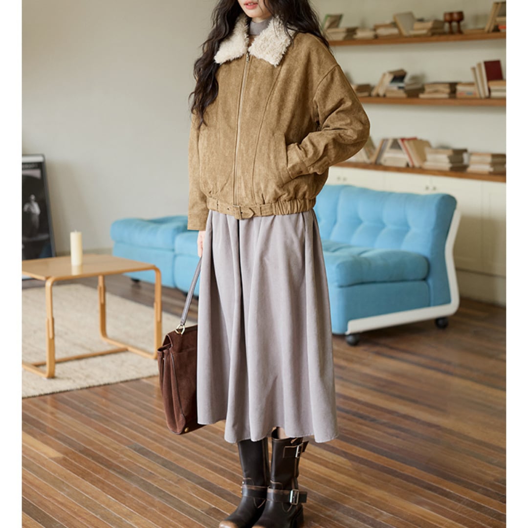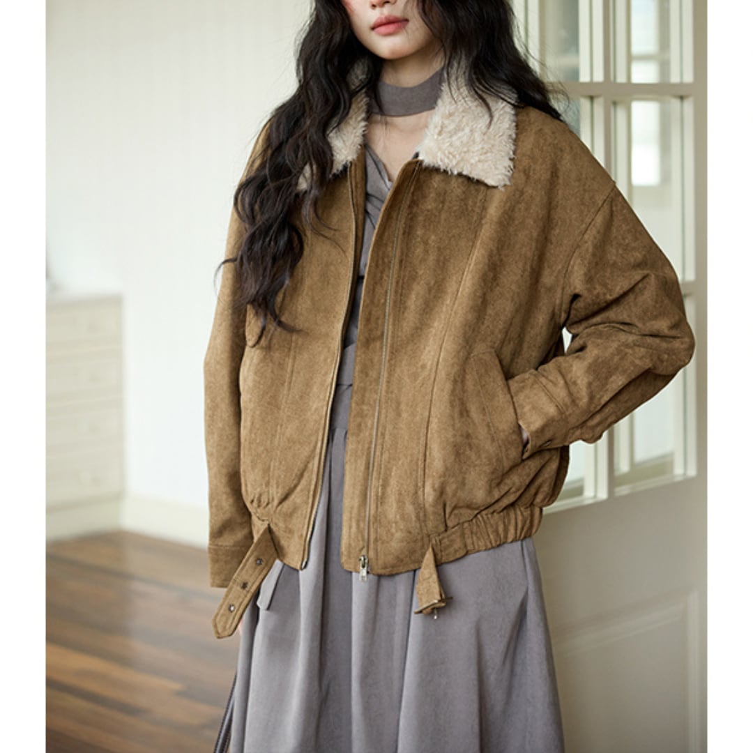 ボア衿がアクセントになった、柔らかなフェイクスエード調素材のショートジャケット。