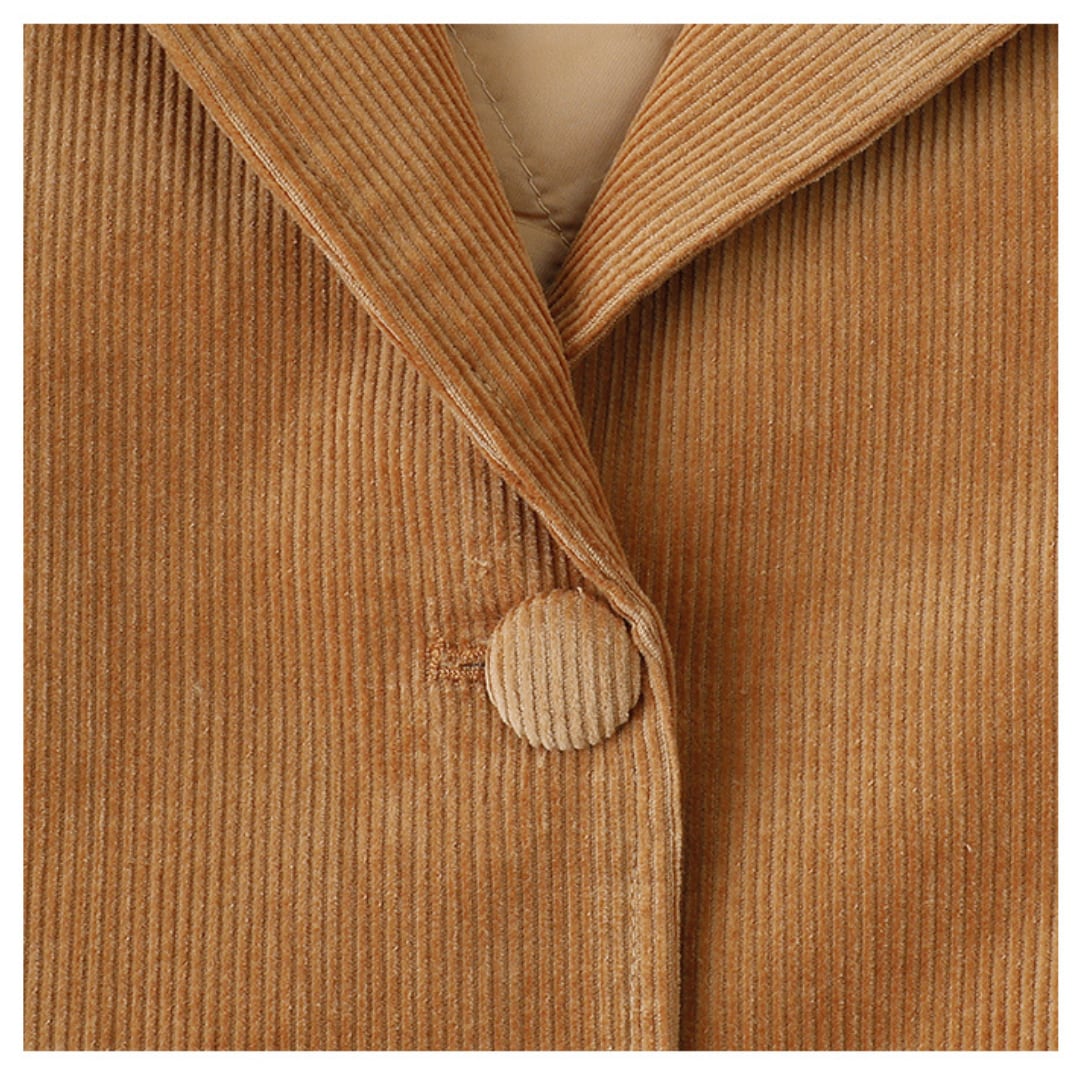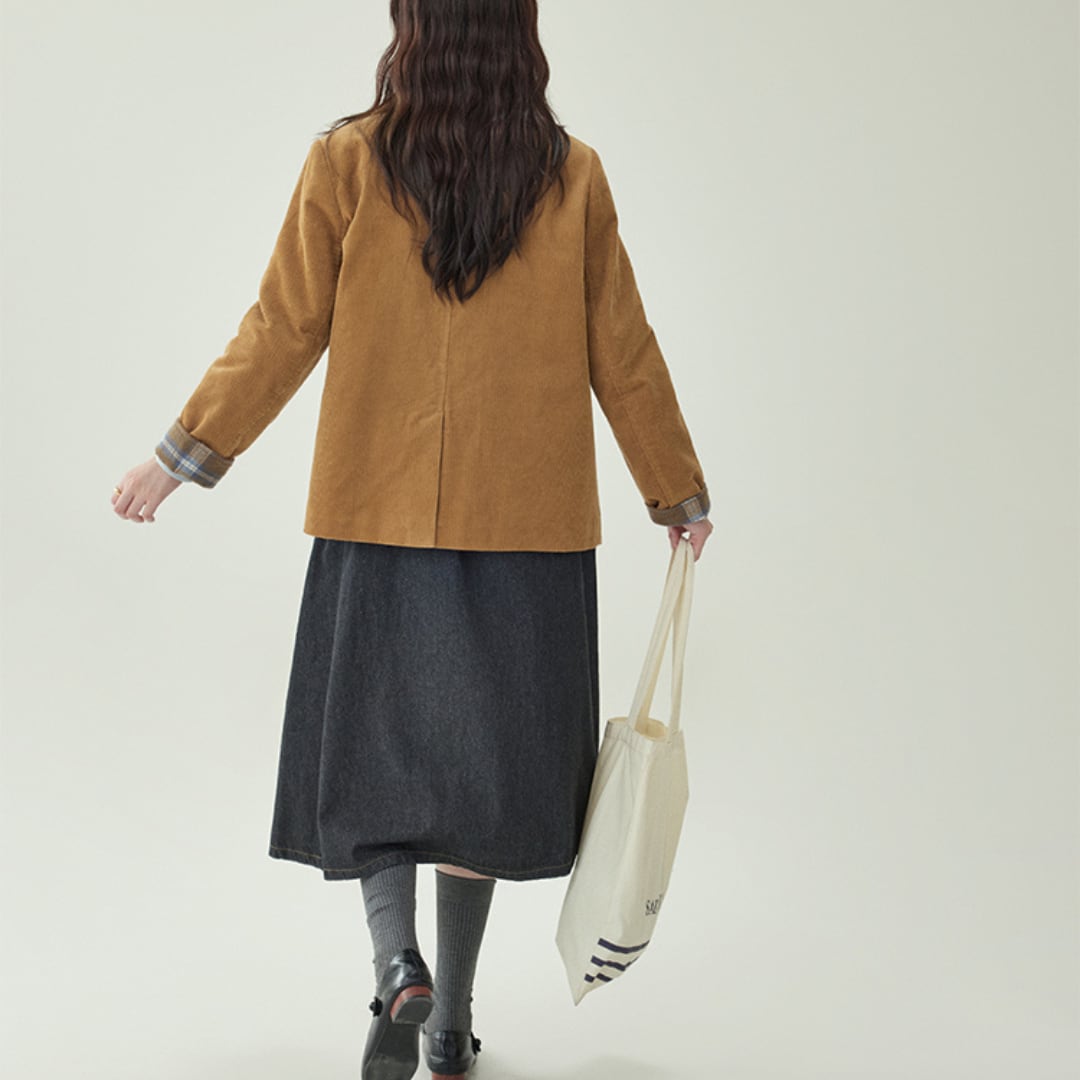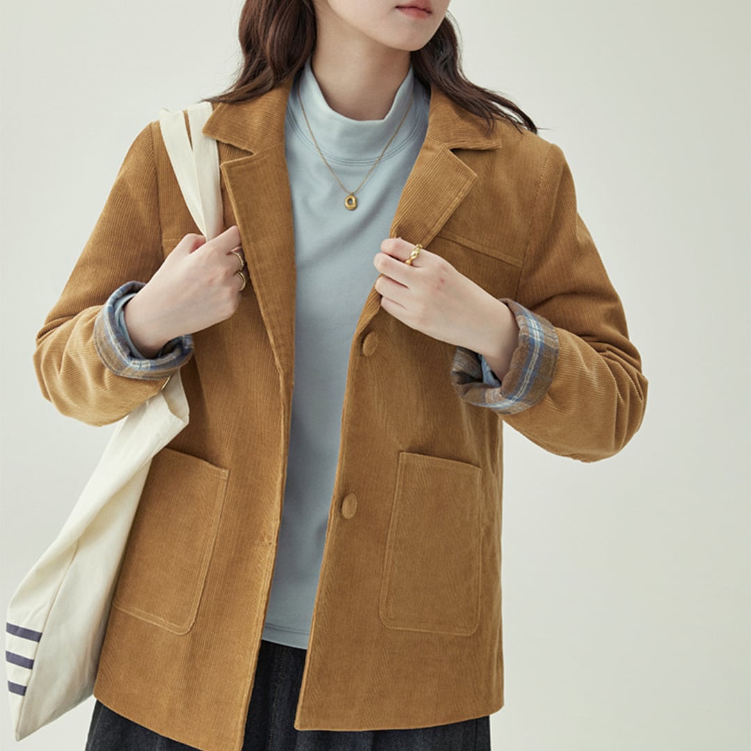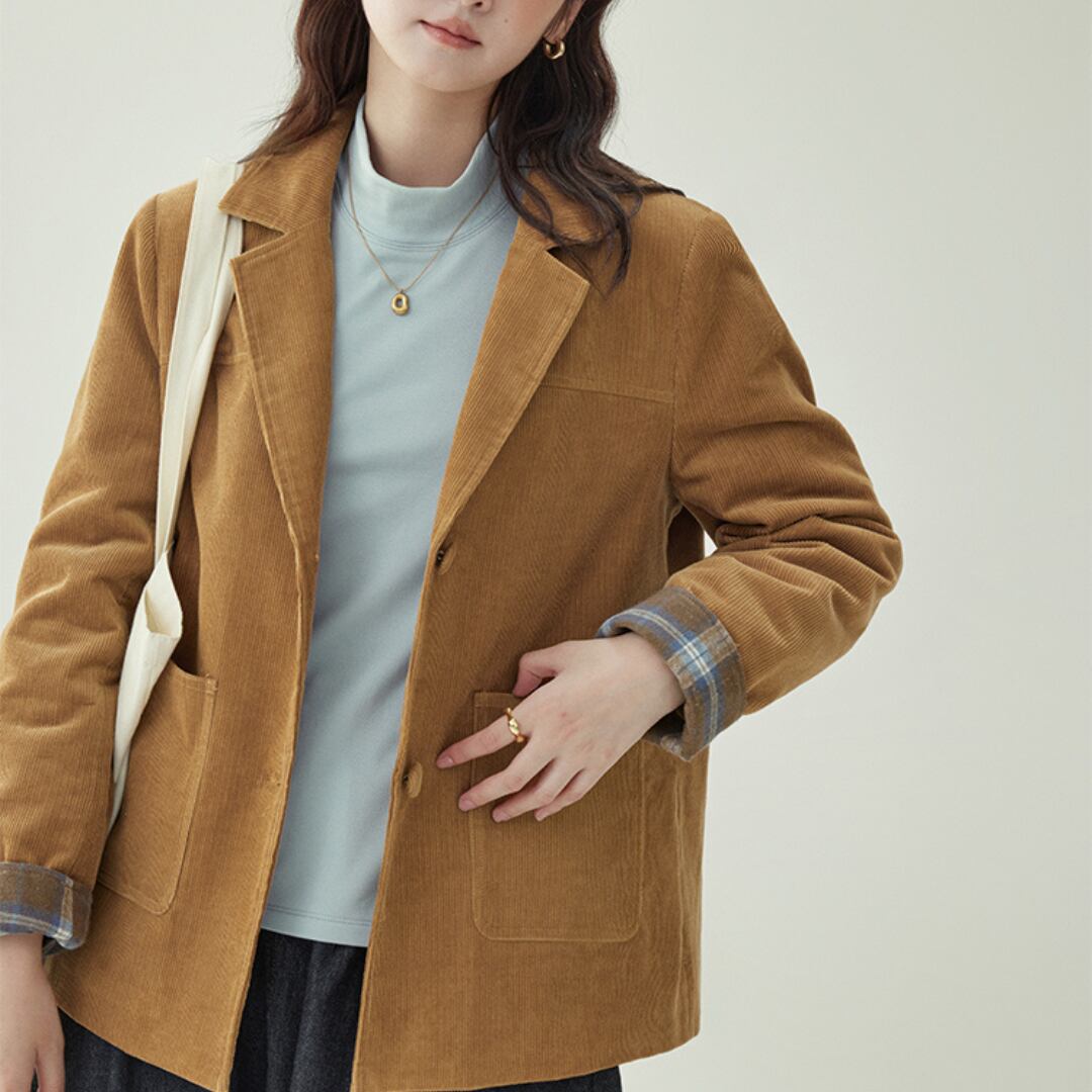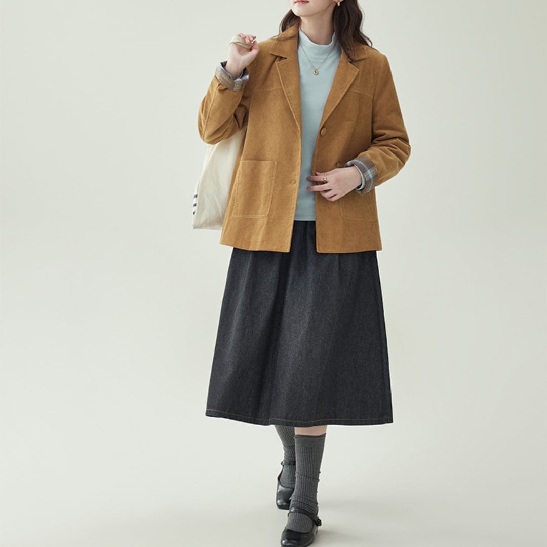 柔らかなコーデュロイ素材とフロントポケットが特徴の、シンプルなテーラードジャケット。