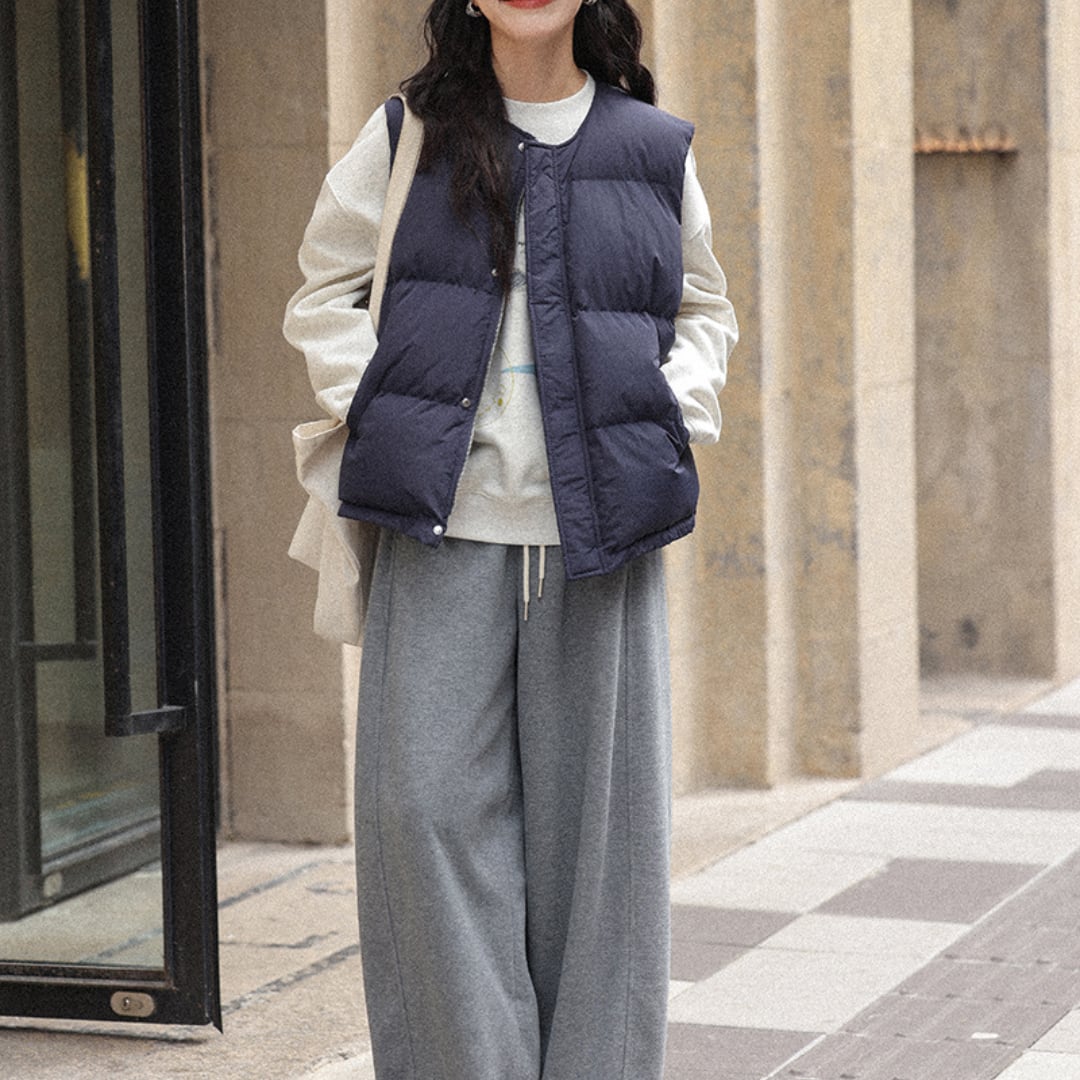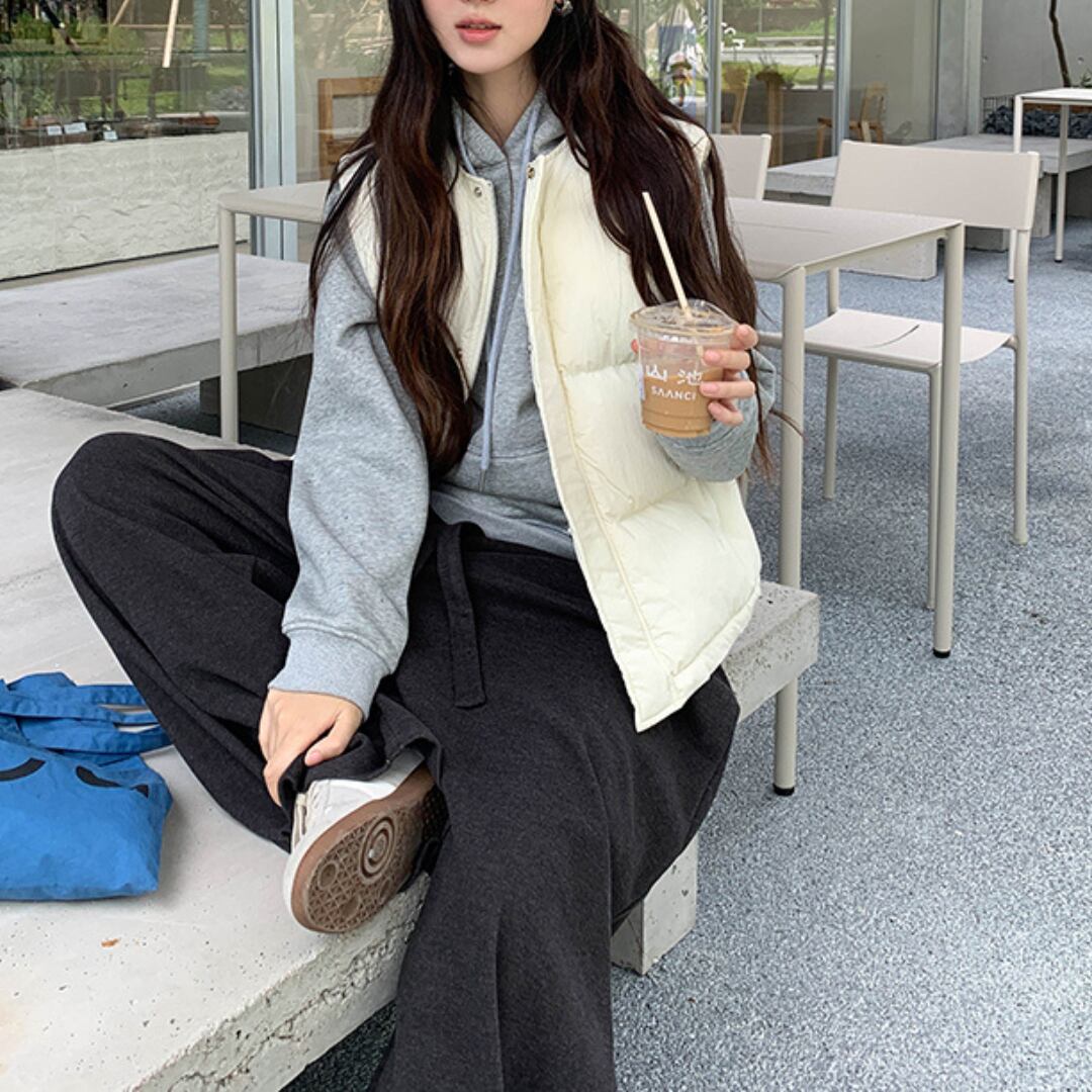 軽やかな着心地と程よいボリューム感が魅力のキルティングベストで、寒い季節の重ね着を快適にしてくれる万能アイテムです。シンプルなデザインながら立体感のあるステッチがアクセントになり、スウェットやニットの上に羽織るだけでバランスよく仕上がります。