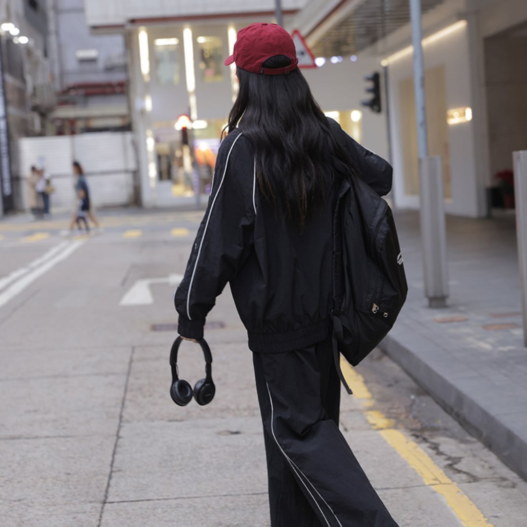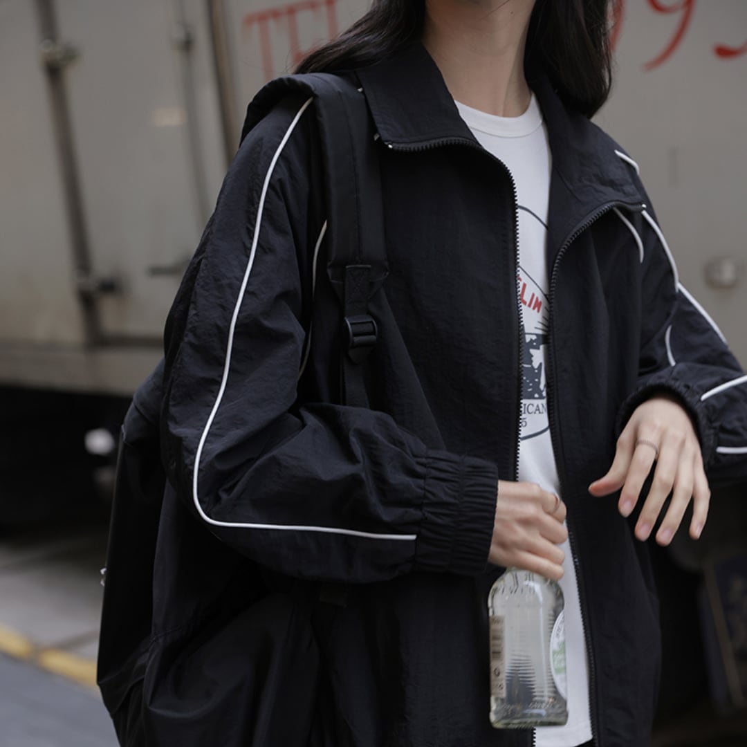 配色パイピングがアクセントになった、スポーティーな印象のジップアップジャケット。