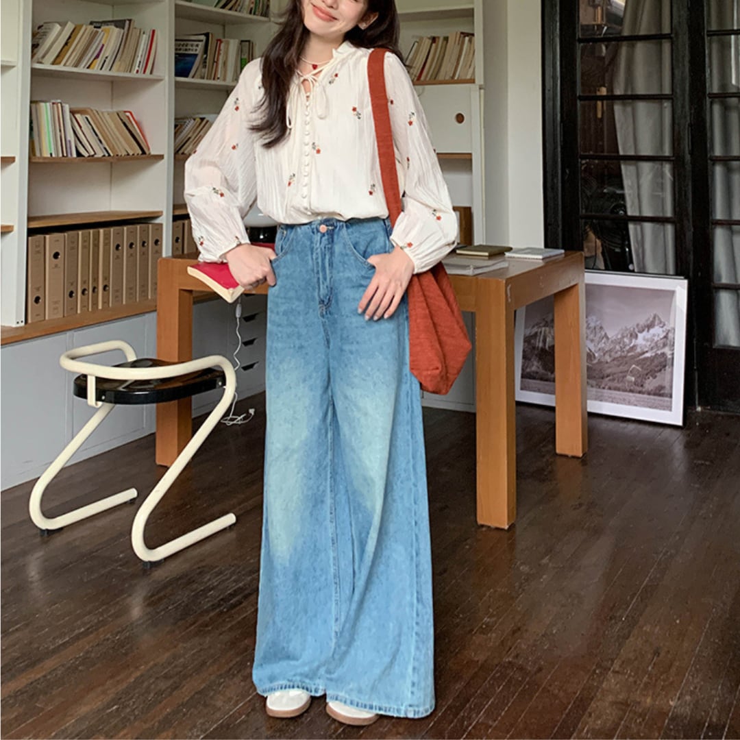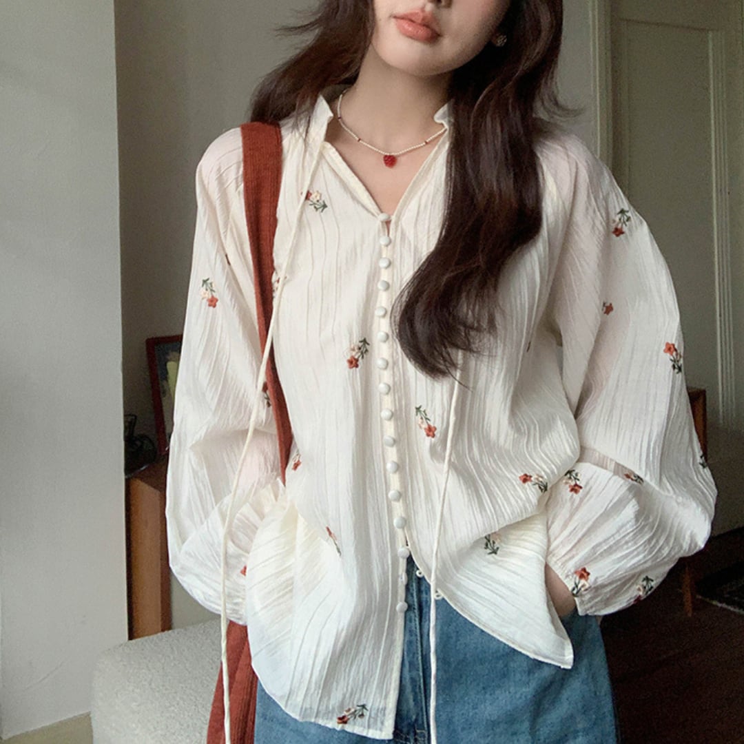 繊細なフラワー刺繍と軽やかな生地感が魅力のスタンドカラーブラウス。