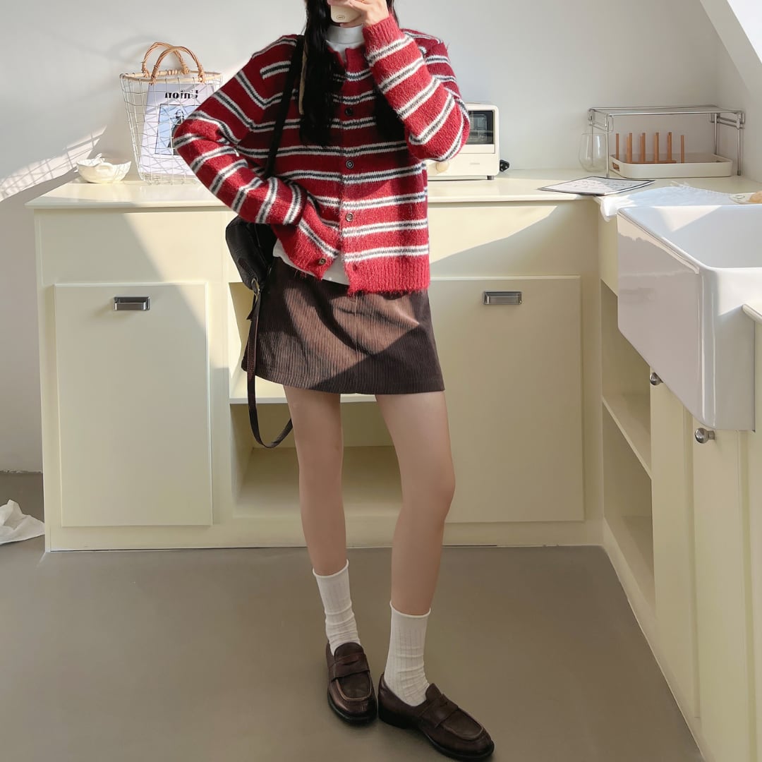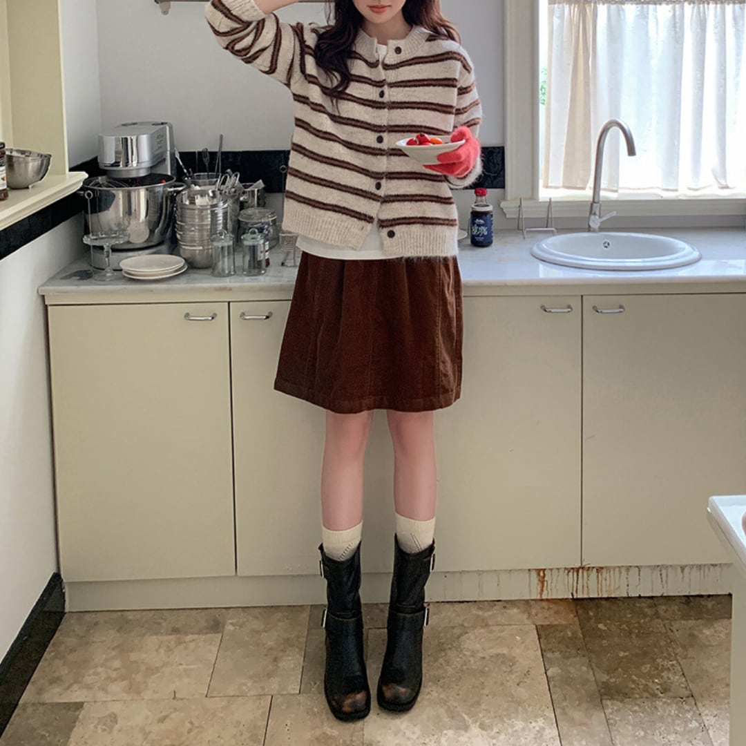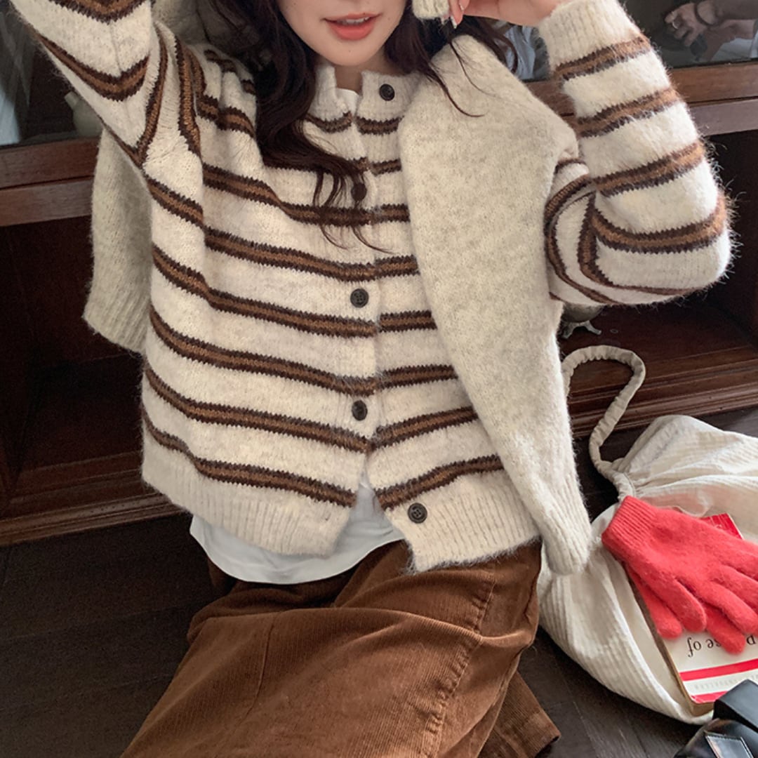 柔らかな質感とボーダー柄が可愛らしい印象を与えるニットカーディガン。