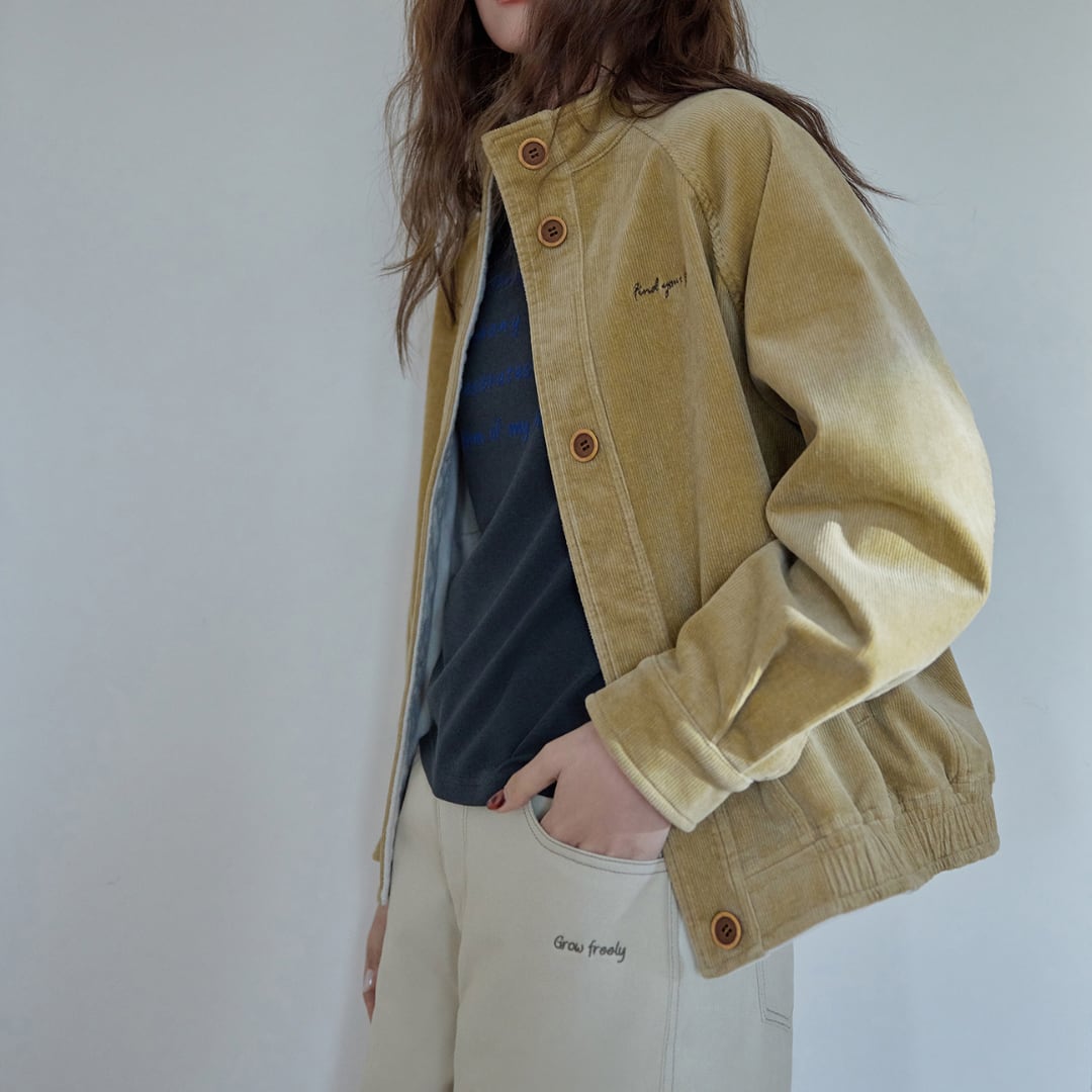 厚手コーデュロイ素材と内側のフリースが暖かさをしっかりキープする、ラグランスリーブの立ち襟ジャケット。