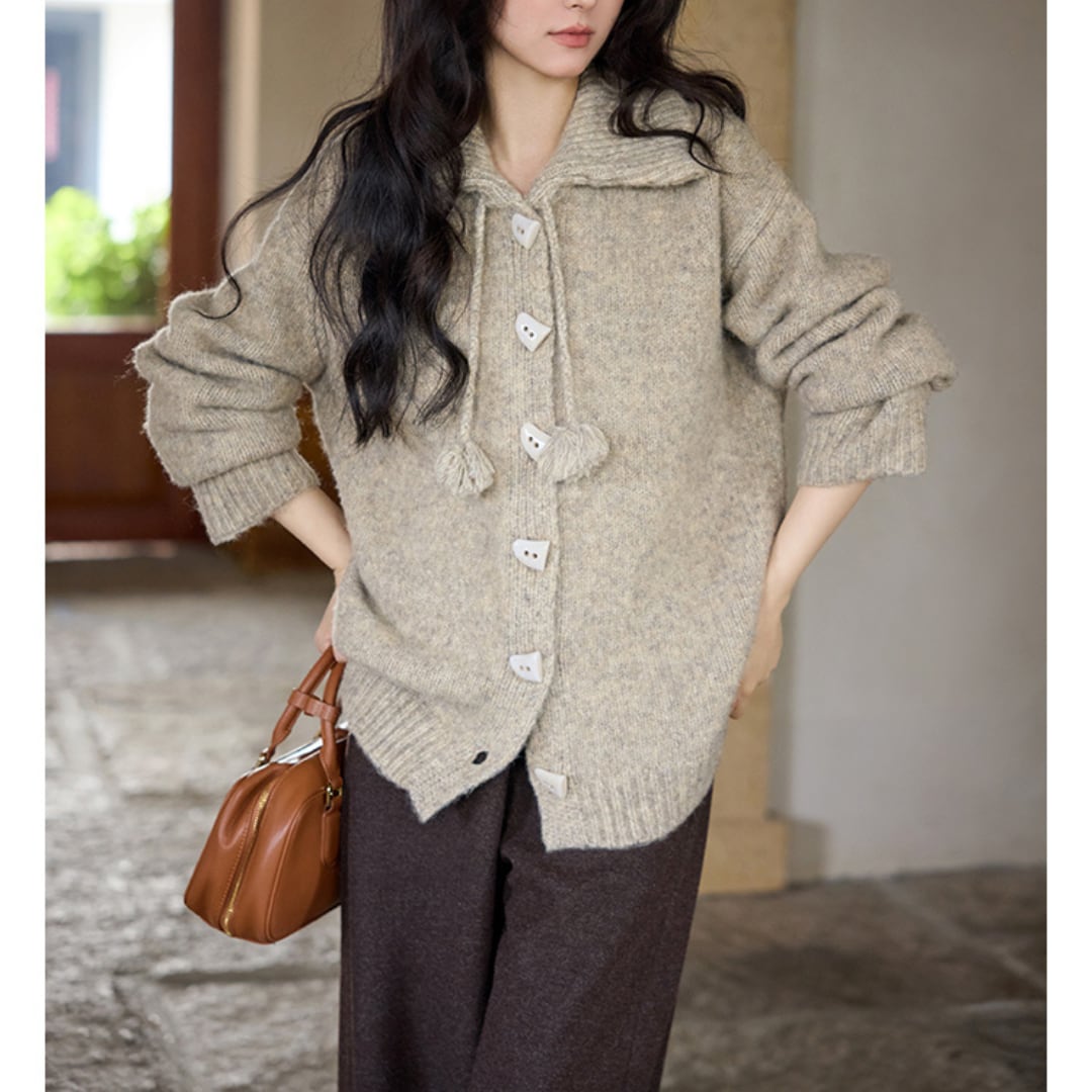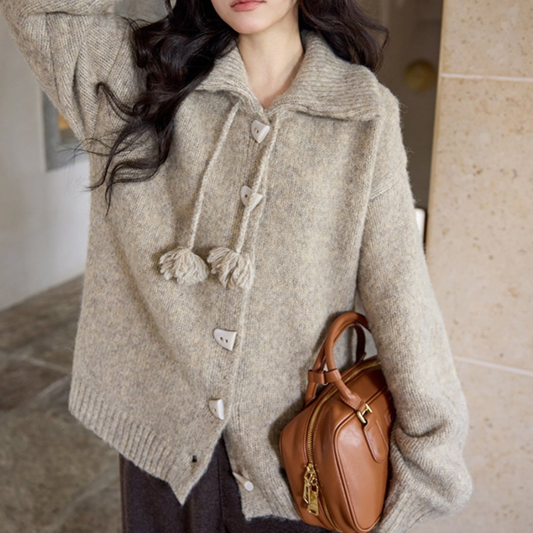 柔らかな糸で編まれたポロカラーのニットカーディガンは、ころんとしたボタンとタッセル付きリボンが可愛らしいアクセント。