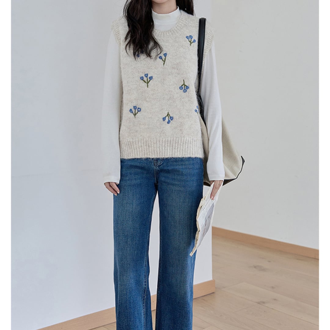 ふんわりとした風合いに小花の刺繍をあしらった、優しげな印象のニットベスト。