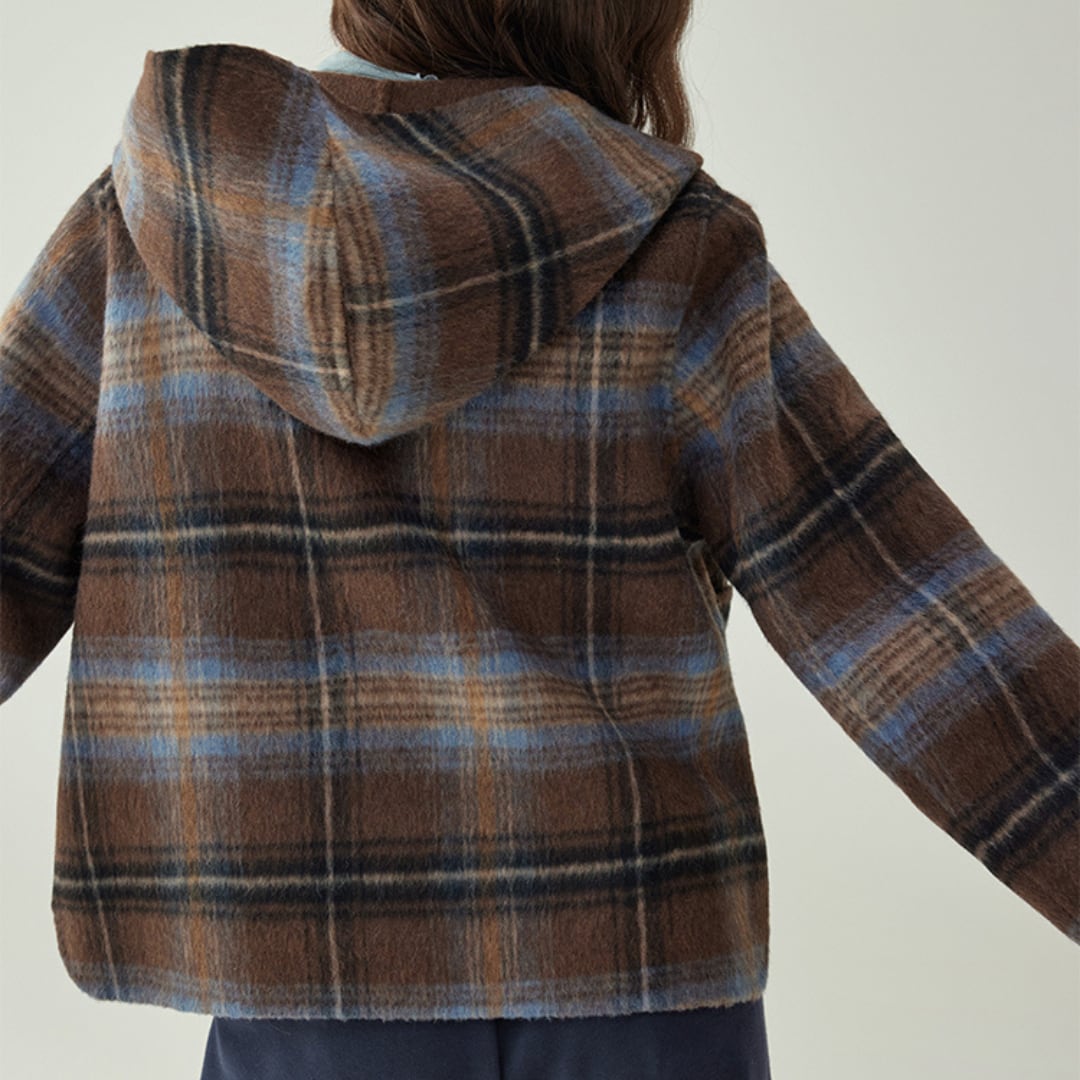 トラッドなチェック柄に牛角風ボタンをあしらった、ゆったりシルエットのショートダッフルコート。