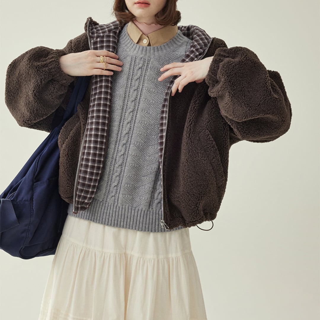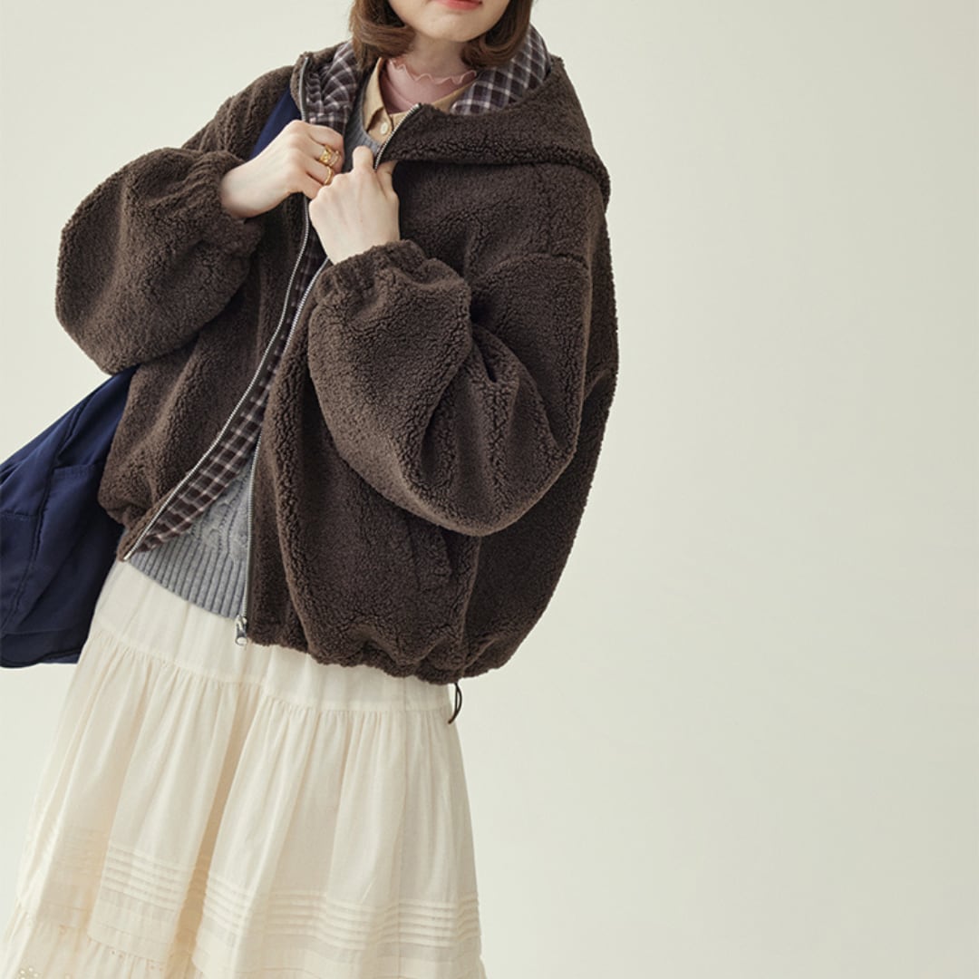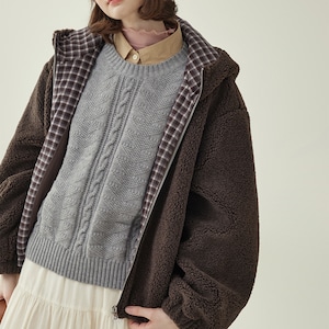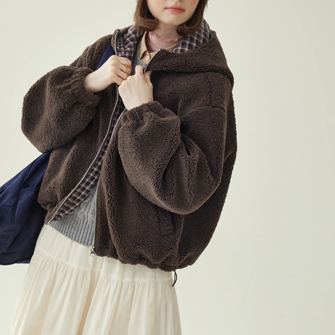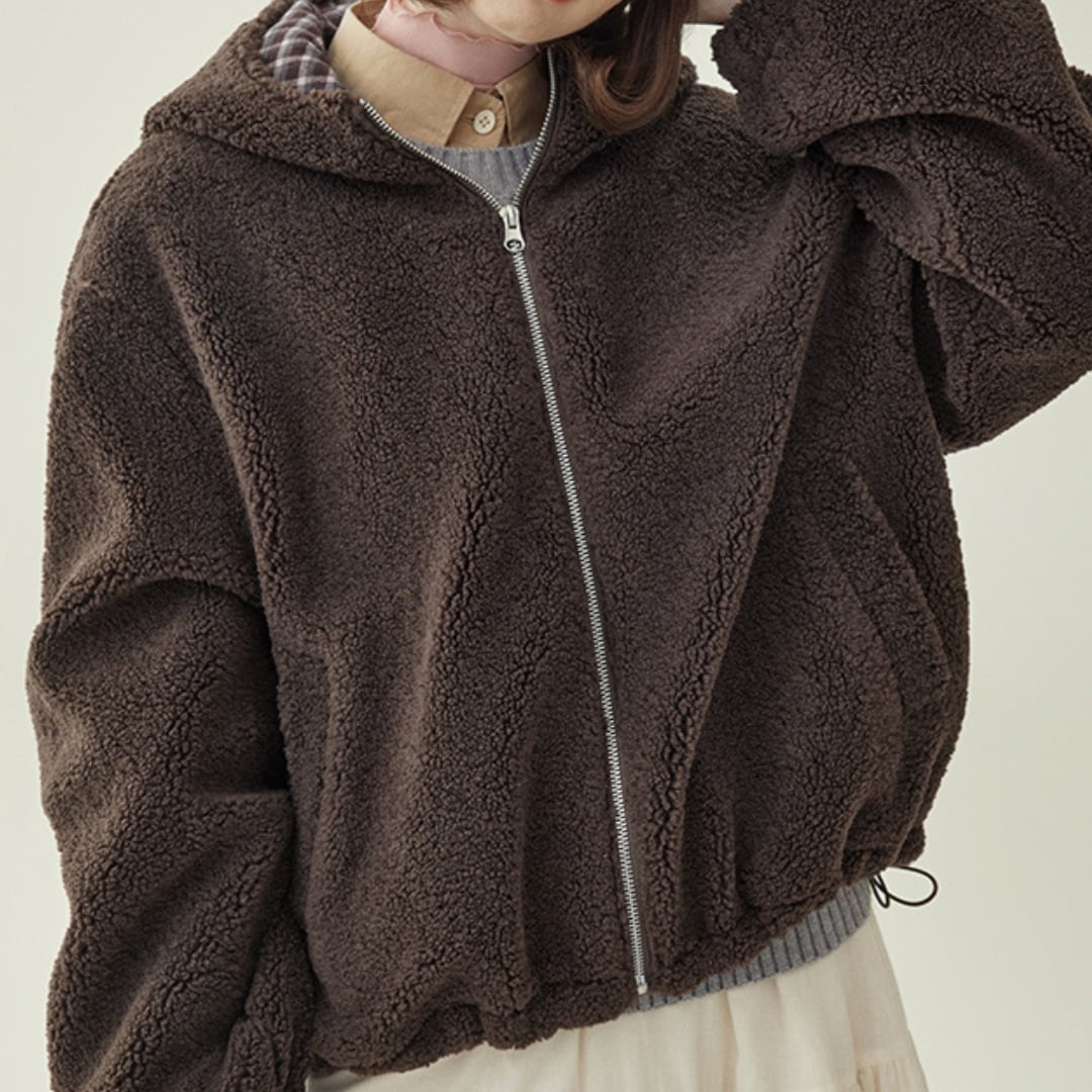 ふんわりとしたボア素材とドローストリング仕様が魅力の、ジップアップタイプのショートブルゾン。