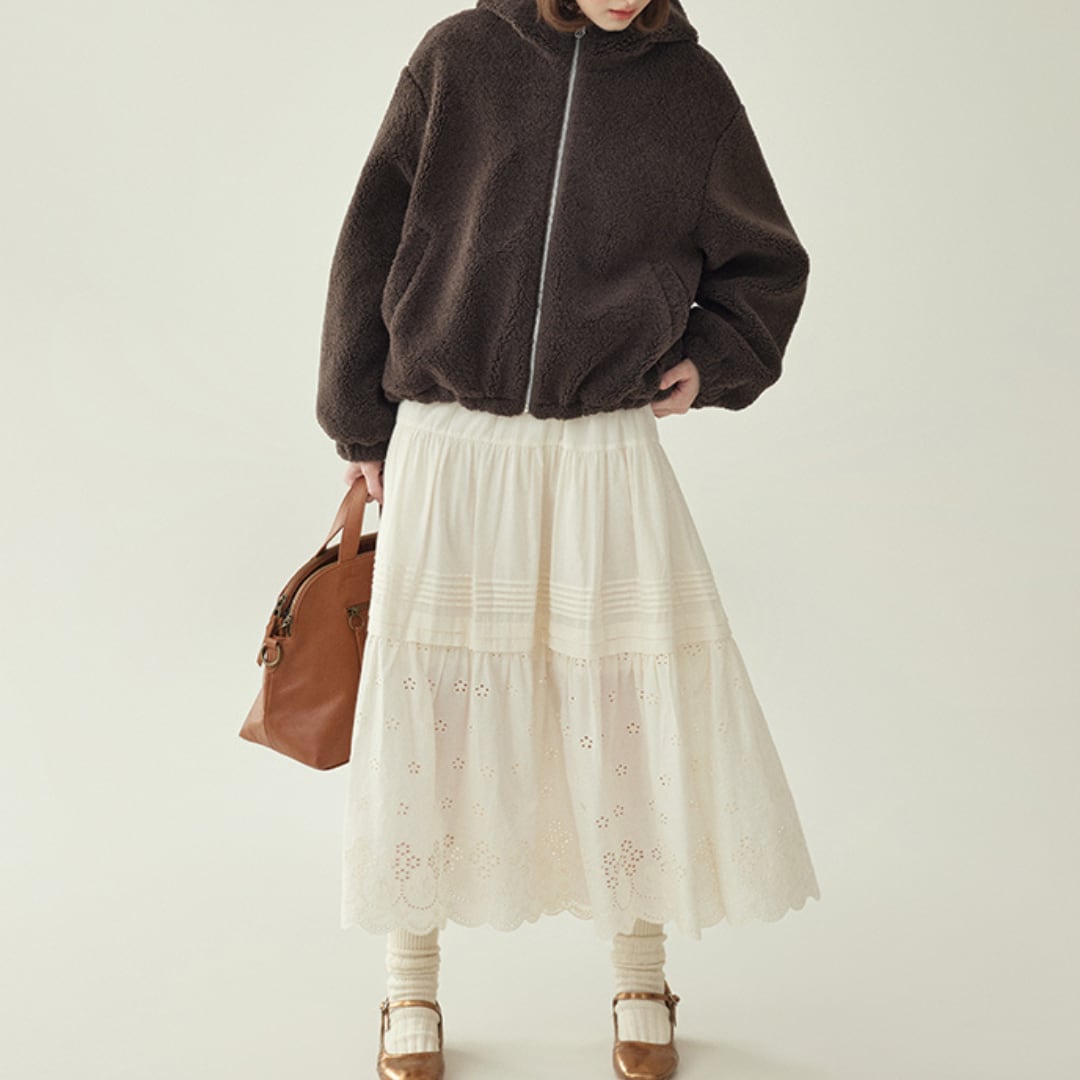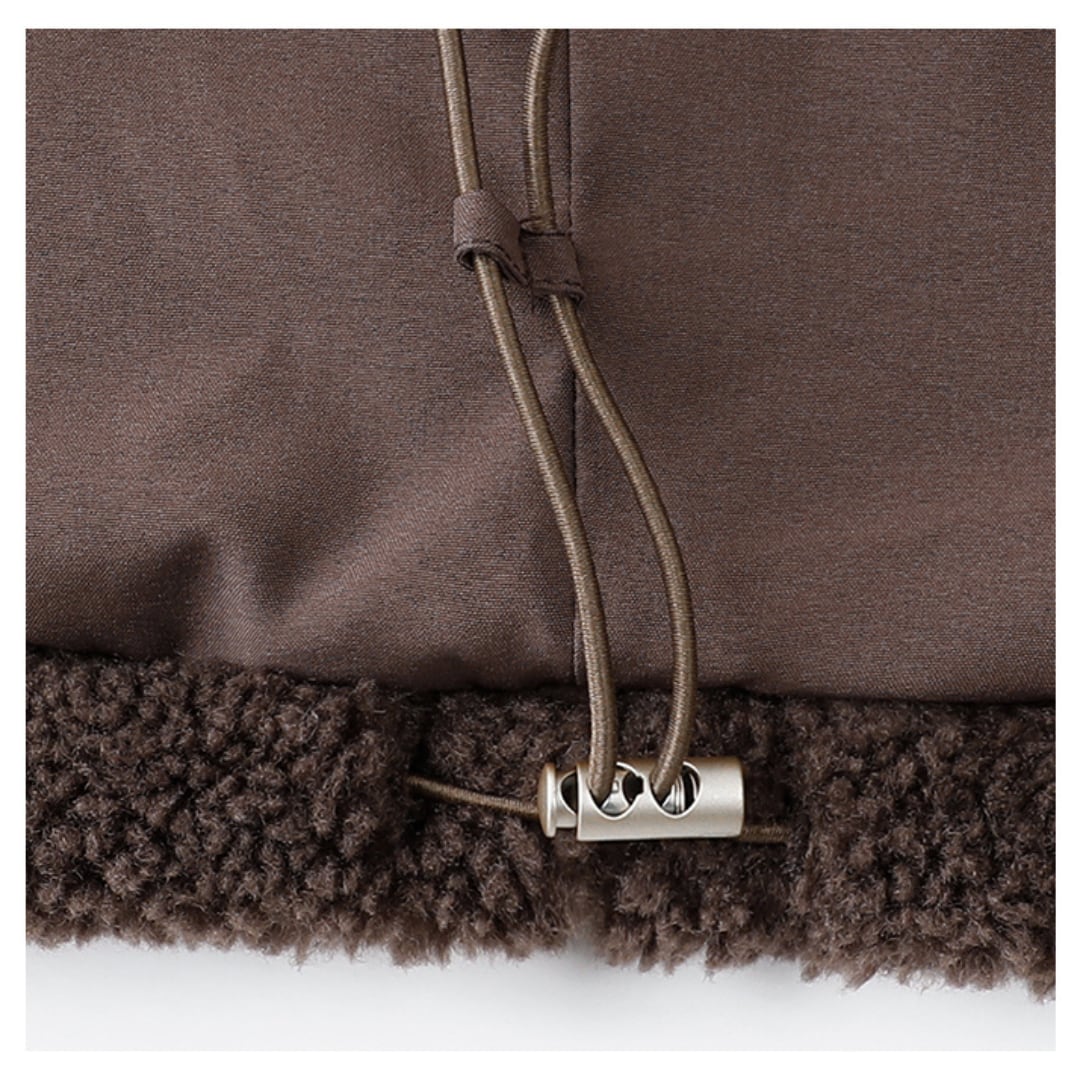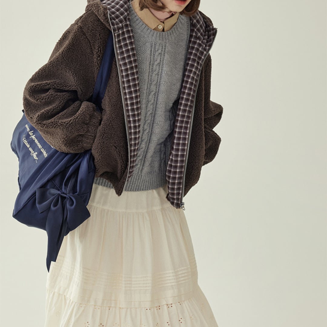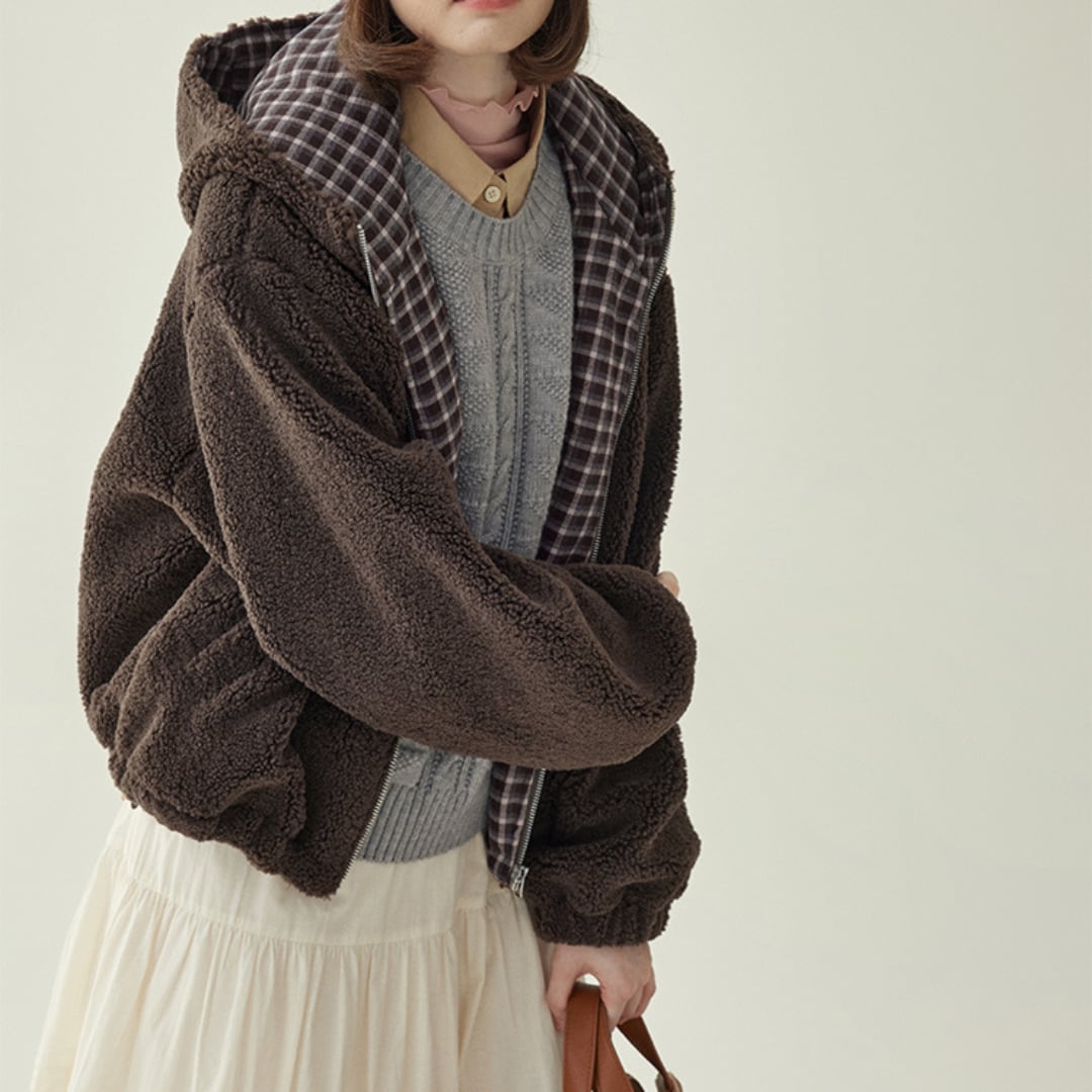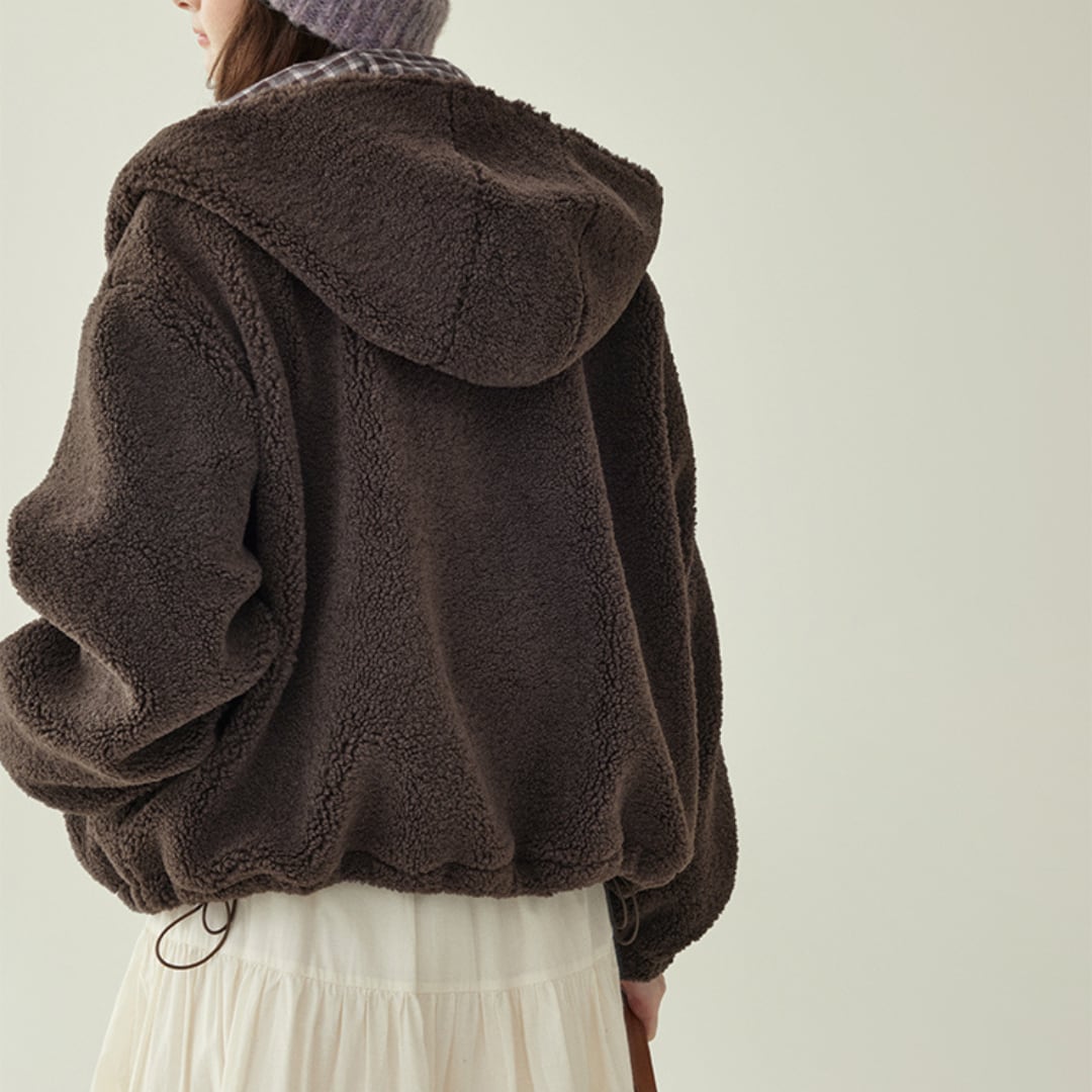 ふんわりとしたボア素材とドローストリング仕様が魅力の、ジップアップタイプのショートブルゾン。