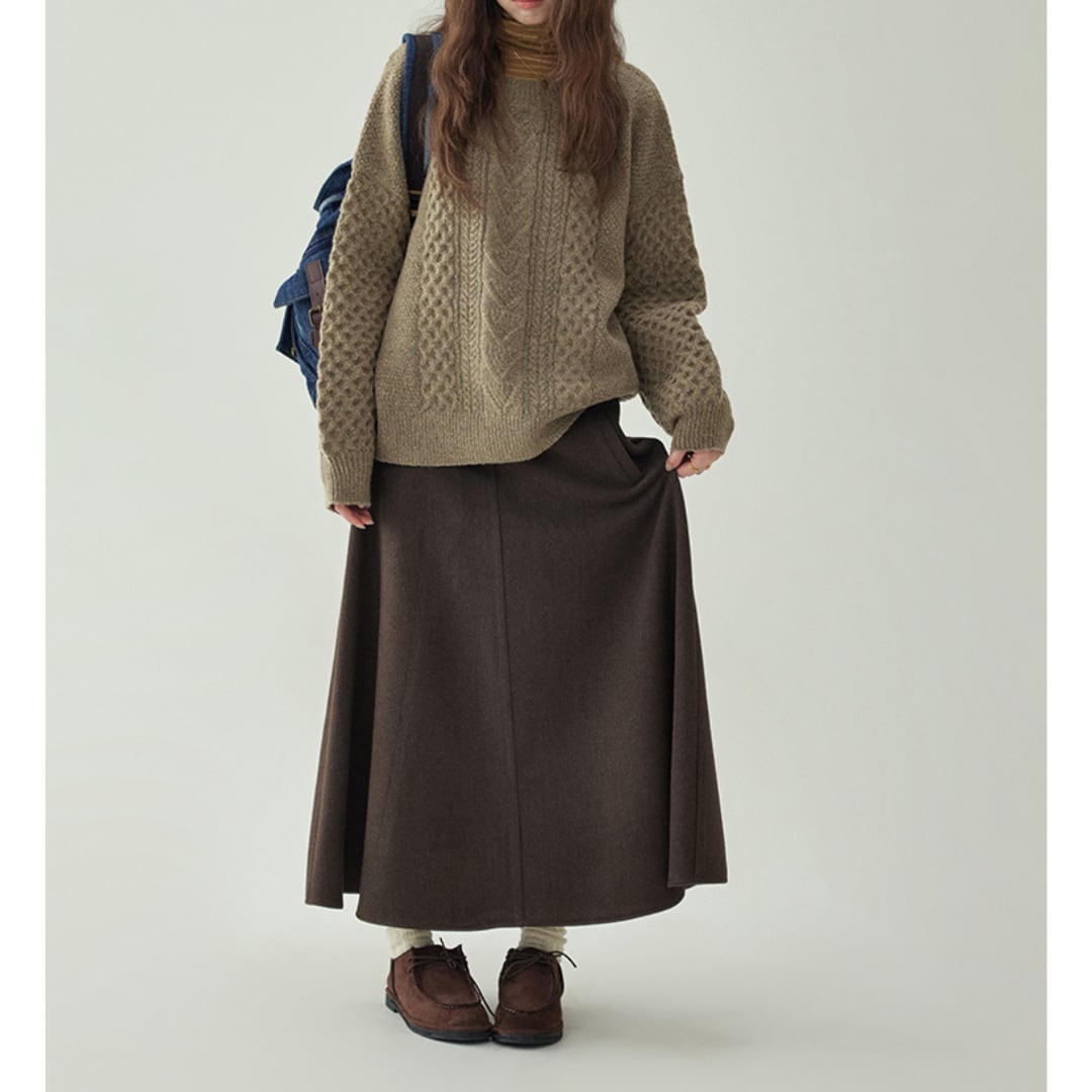 上品な落ち感とたっぷりのフレアラインが魅力の、ウール混素材のロングスカート。
