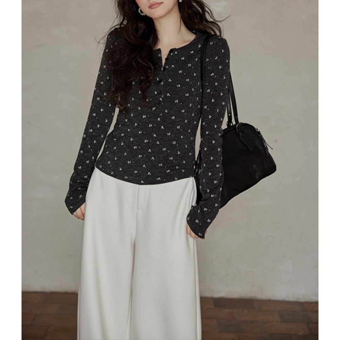 小花柄とフロントボタンがアクセントになった、フェミニンな印象のリブカットソー。