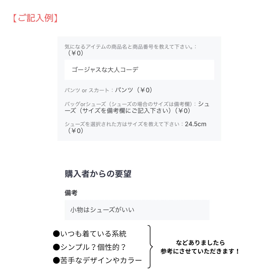 喜んでいただけるように下記のアンケートにお答えいただいた上で、ショップオーナーがおすすめアイテムをセレクトさせていただきます。